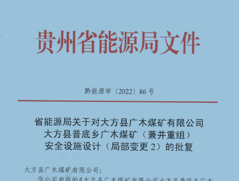 大方縣廣木煤礦有限公司 大方縣普底鄉(xiāng)廣木煤礦(兼并重組) 安全設(shè)施設(shè)計(局部變更2)