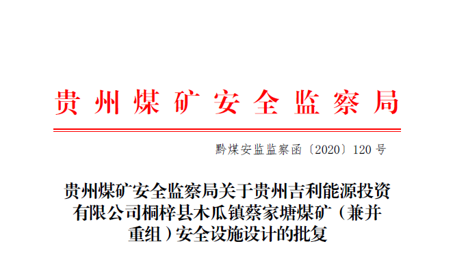 貴州吉利能源投資有限公司 桐梓縣木瓜鎮(zhèn)蔡家塘煤礦(兼并重組)安全設(shè)施設(shè)計(jì)