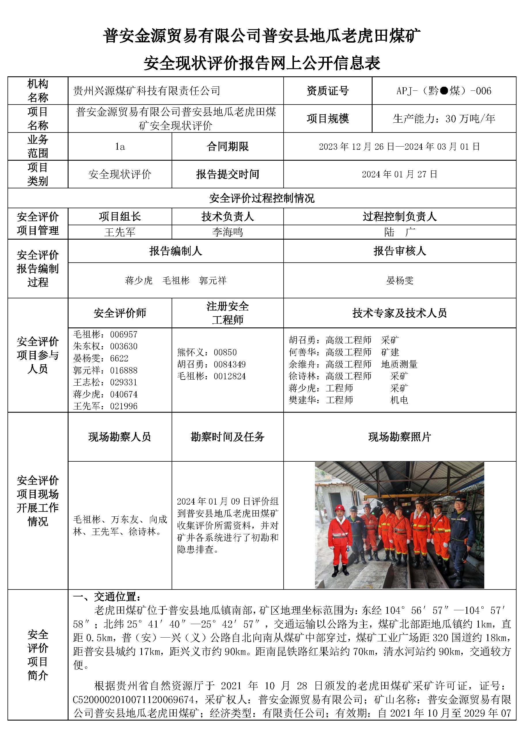普安金源貿(mào)易有限公司普安縣地瓜老虎田煤礦安全現(xiàn)狀評價(jià)報(bào)告網(wǎng)上公開信息表