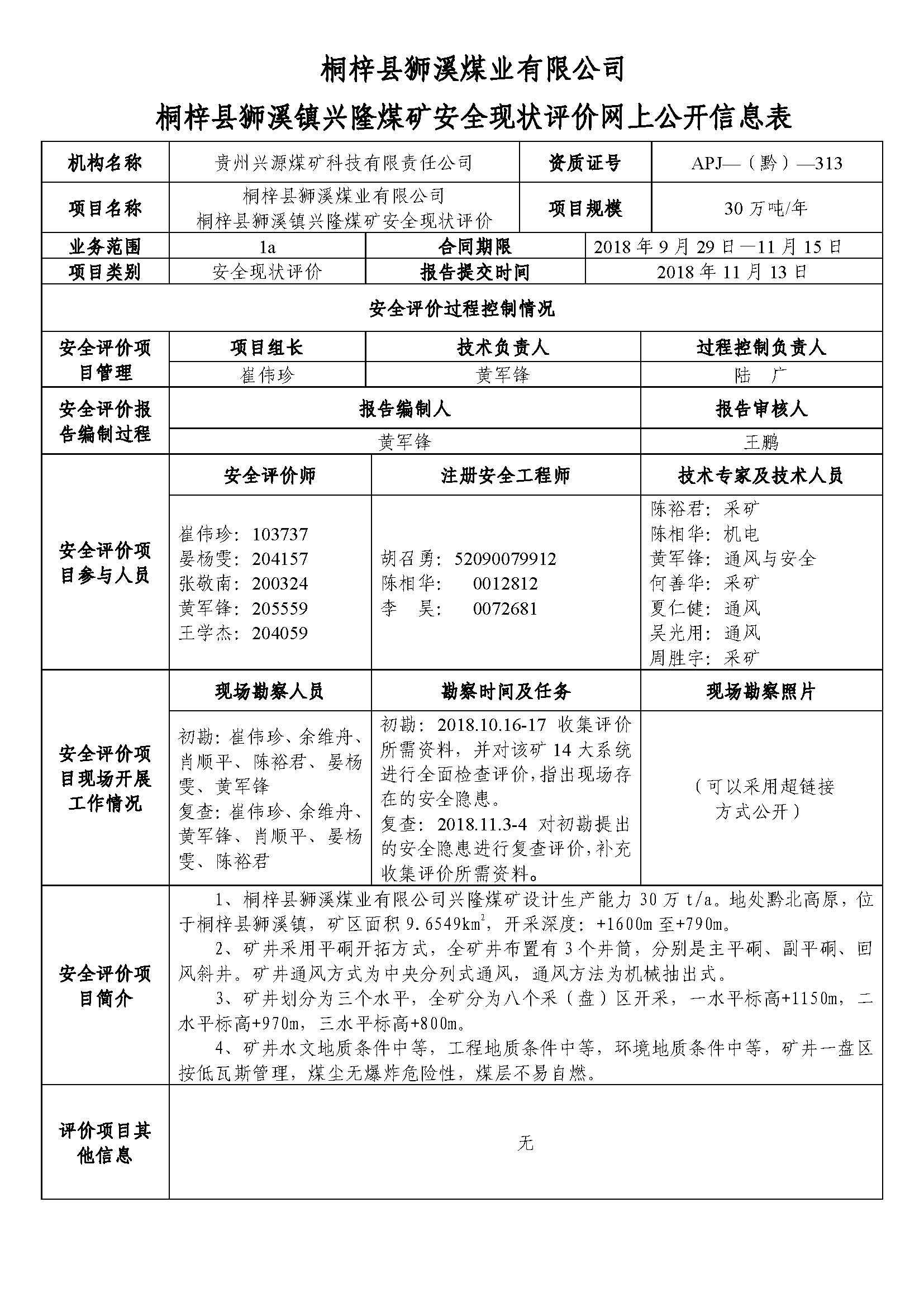 桐梓縣獅溪煤業(yè)有限公司桐梓縣獅溪鎮(zhèn)興隆煤礦安全現(xiàn)狀評價網(wǎng)上公開信息表