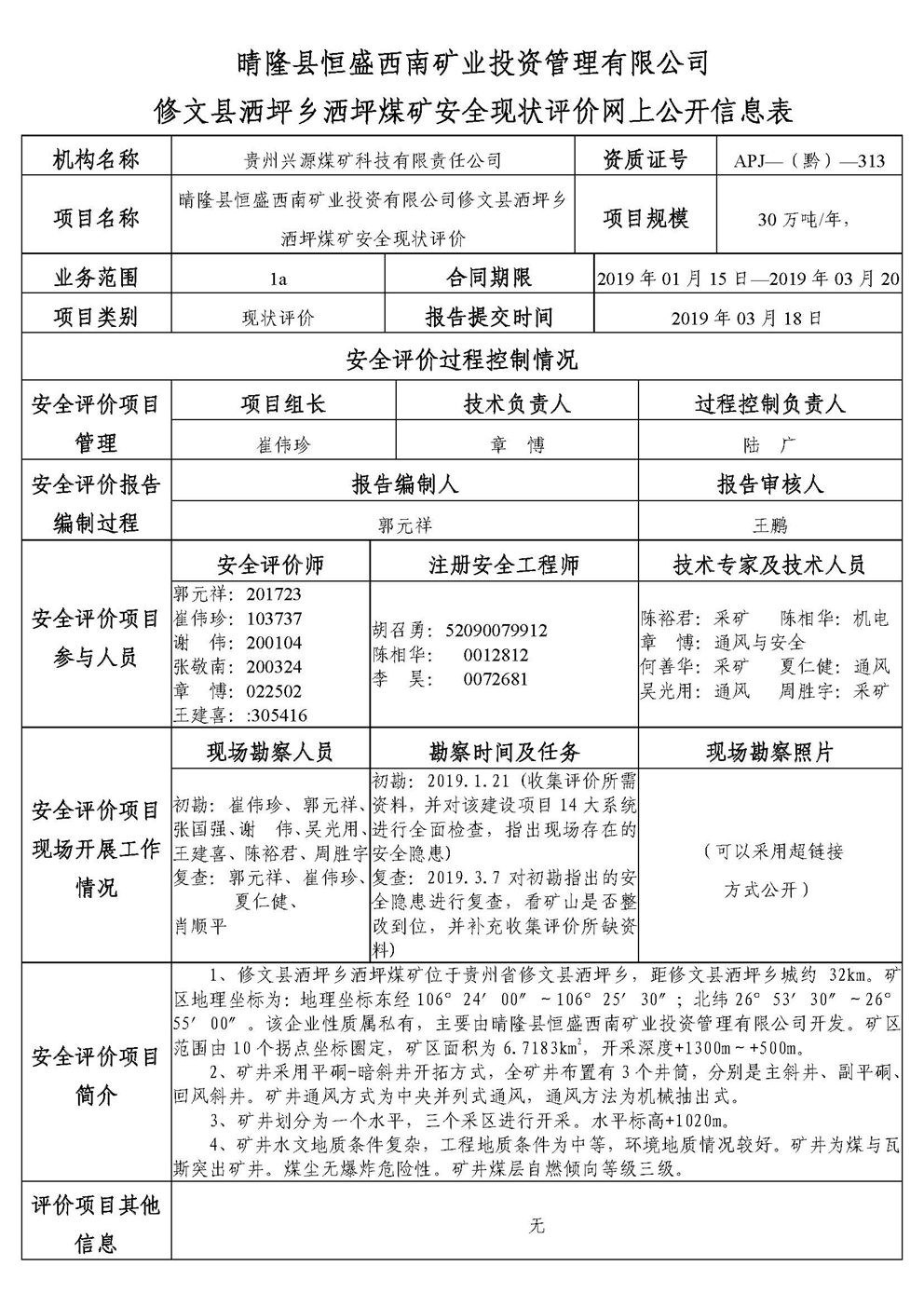晴隆縣恒盛西南礦業(yè)投資管理有限公司修文縣灑坪鄉(xiāng)灑坪煤礦安全現(xiàn)狀評(píng)價(jià)網(wǎng)上公開(kāi)信息表