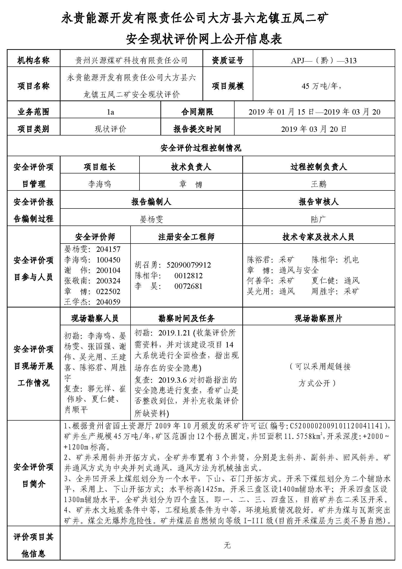 永貴能源開發(fā)有限責(zé)任公司大方縣六龍鎮(zhèn)五鳳二礦安全現(xiàn)狀評價網(wǎng)上公開信息表