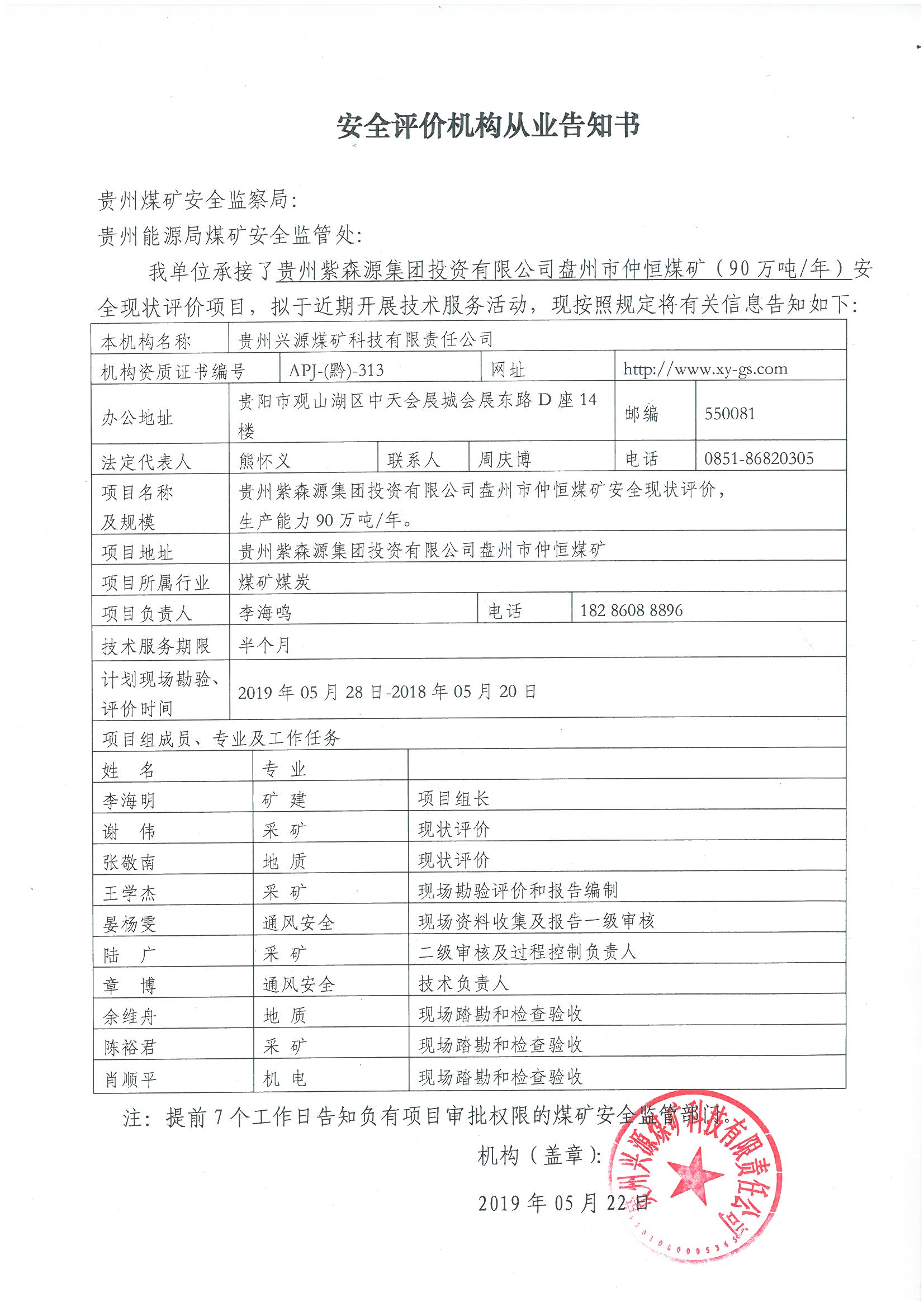 安全評(píng)價(jià)機(jī)構(gòu)從業(yè)告知書【貴州紫森源集團(tuán)投資有限公司盤州市仲恒煤礦】
