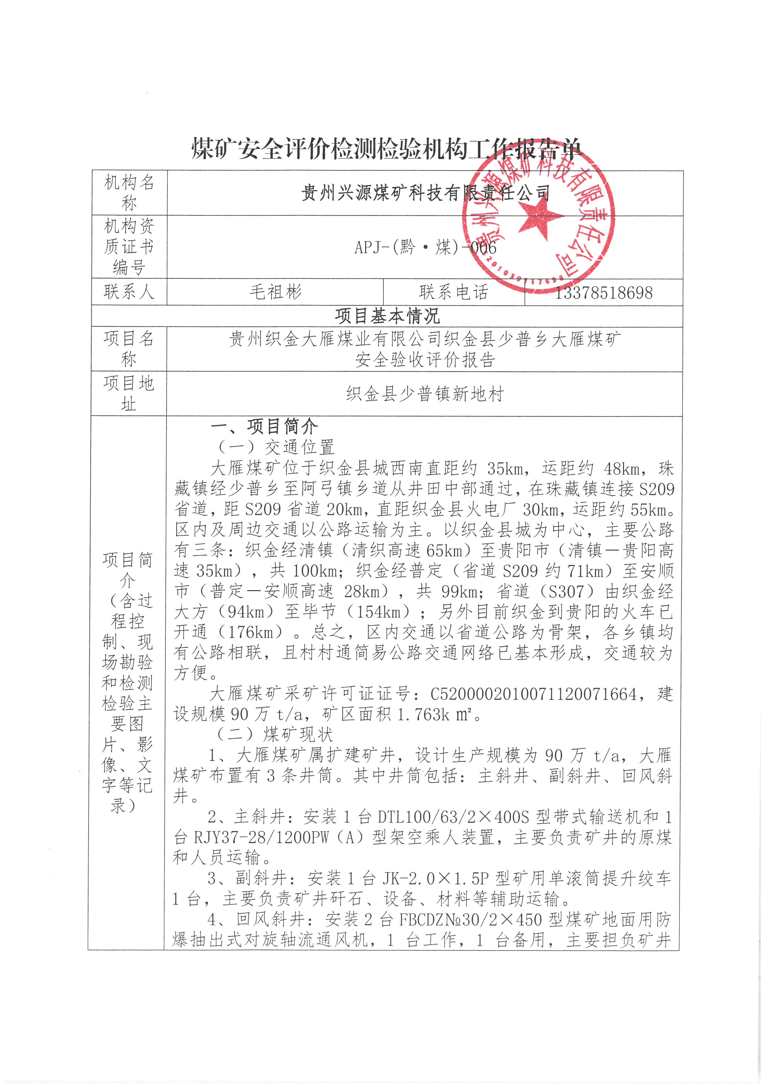 煤礦安全評價檢測檢驗機構(gòu)工作報告單【貴州織金大雁煤業(yè)有限公司織金縣少普鄉(xiāng)大雁煤礦安全驗收評價報告】