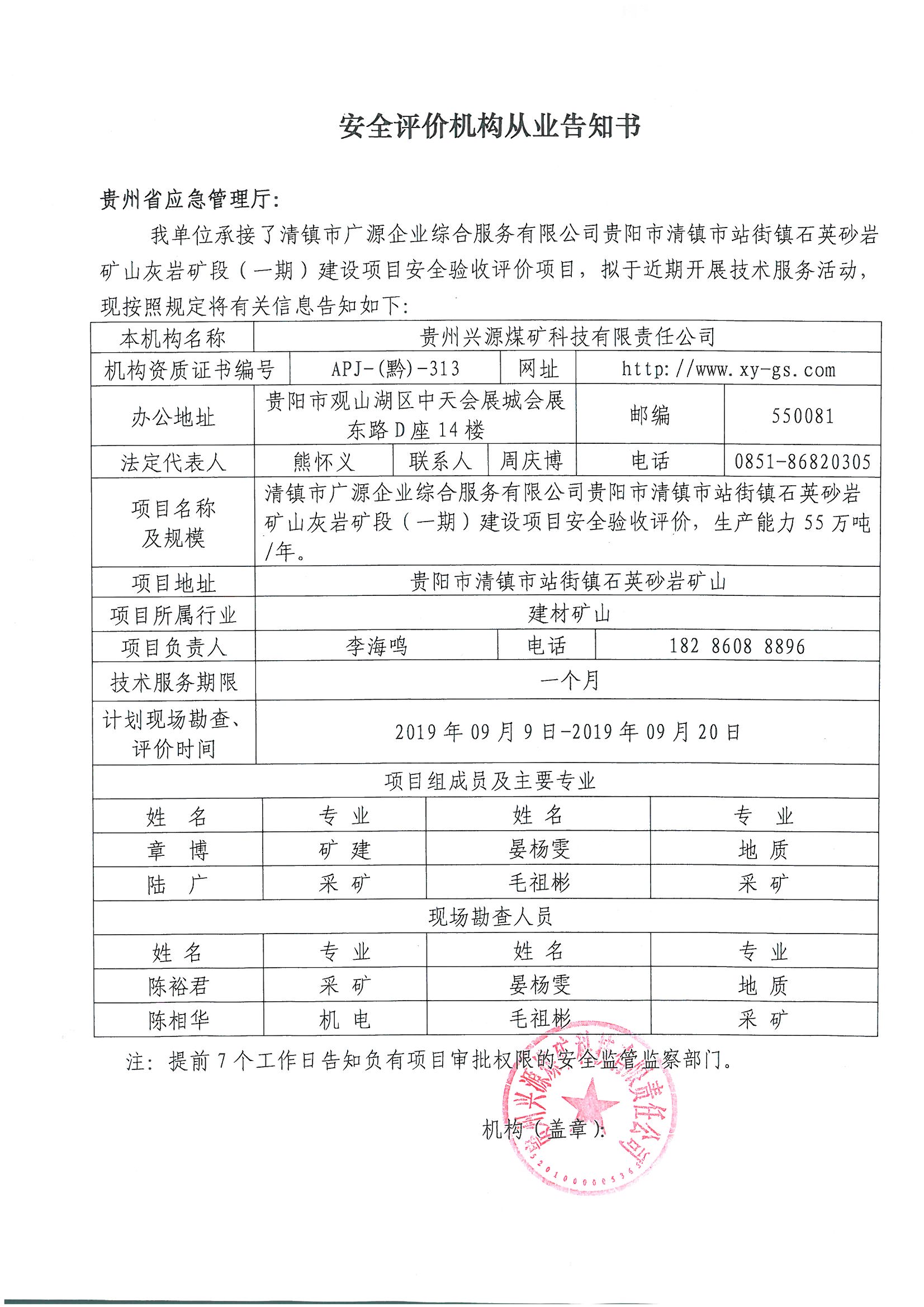 安全評價(jià)機(jī)構(gòu)從業(yè)告知書【清鎮(zhèn)市廣源企業(yè)綜合服務(wù)有限公司貴陽市清鎮(zhèn)市站街鎮(zhèn)石英砂巖礦山灰?guī)r礦段(一)期建設(shè)項(xiàng)目】