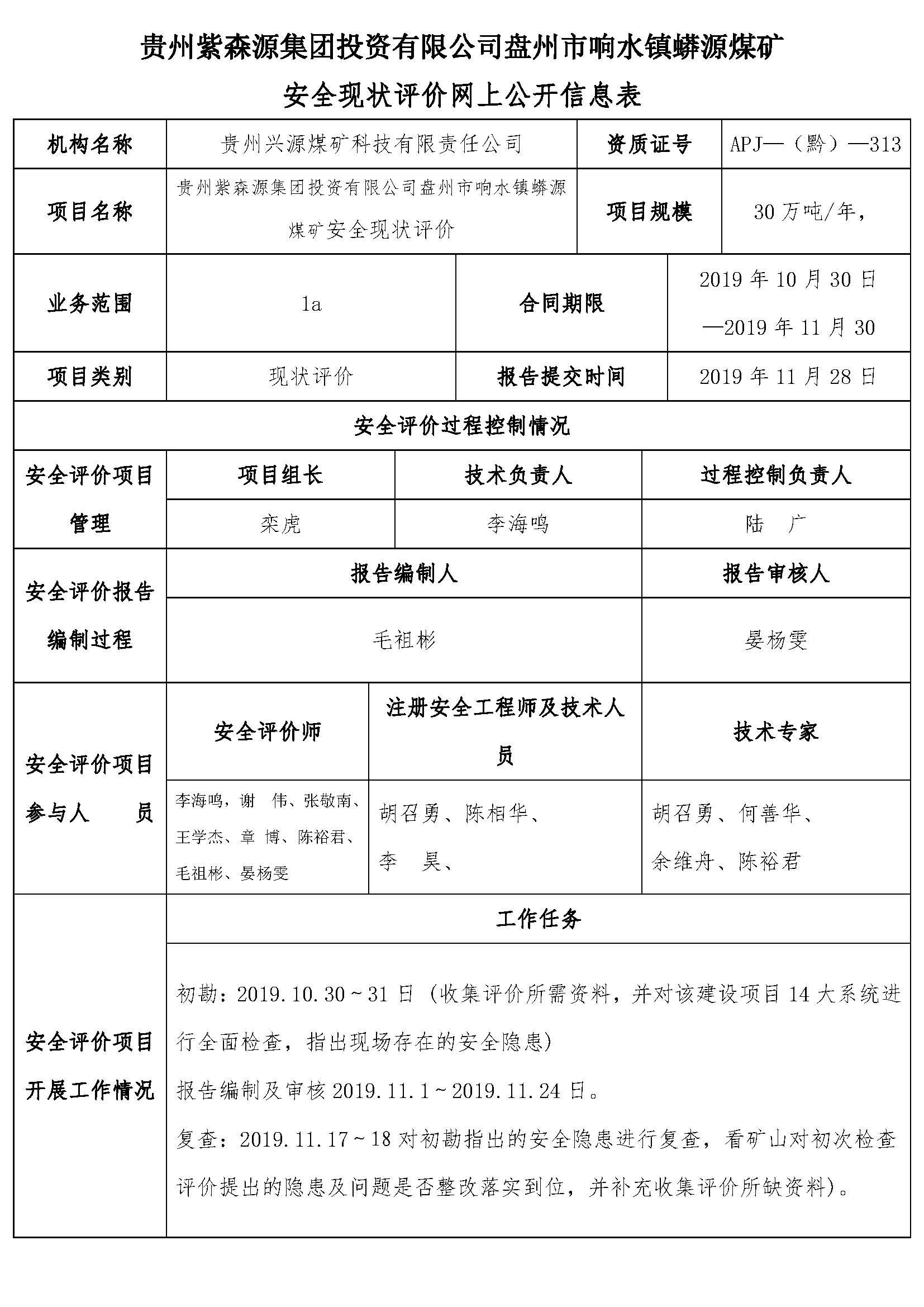 貴州紫森源集團(tuán)投資有限公司盤州市響水鎮(zhèn)蟒源煤礦安全現(xiàn)狀評價(jià)網(wǎng)上公開信息表