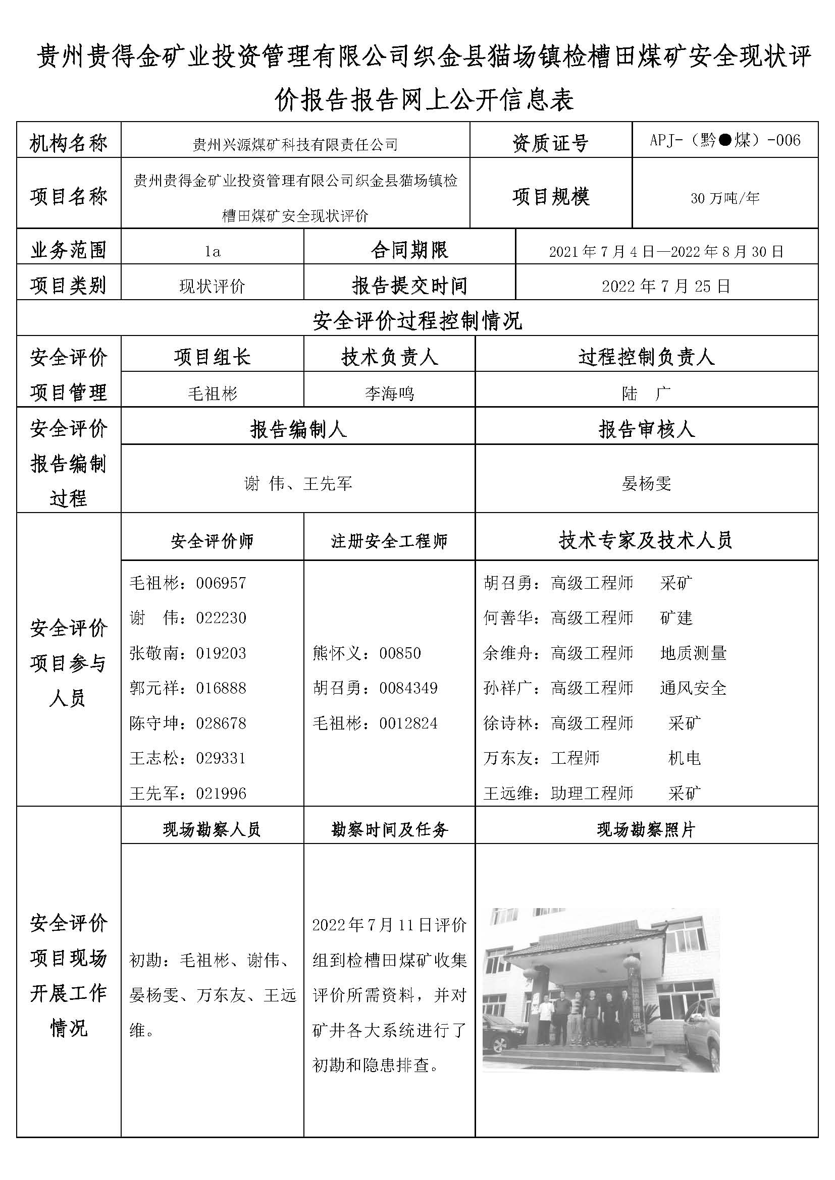 貴州貴得金礦業(yè)投資管理有限公司織金縣貓場(chǎng)鎮(zhèn)檢槽田煤礦安全現(xiàn)狀評(píng)價(jià)報(bào)告報(bào)告網(wǎng)上公開(kāi)信息表