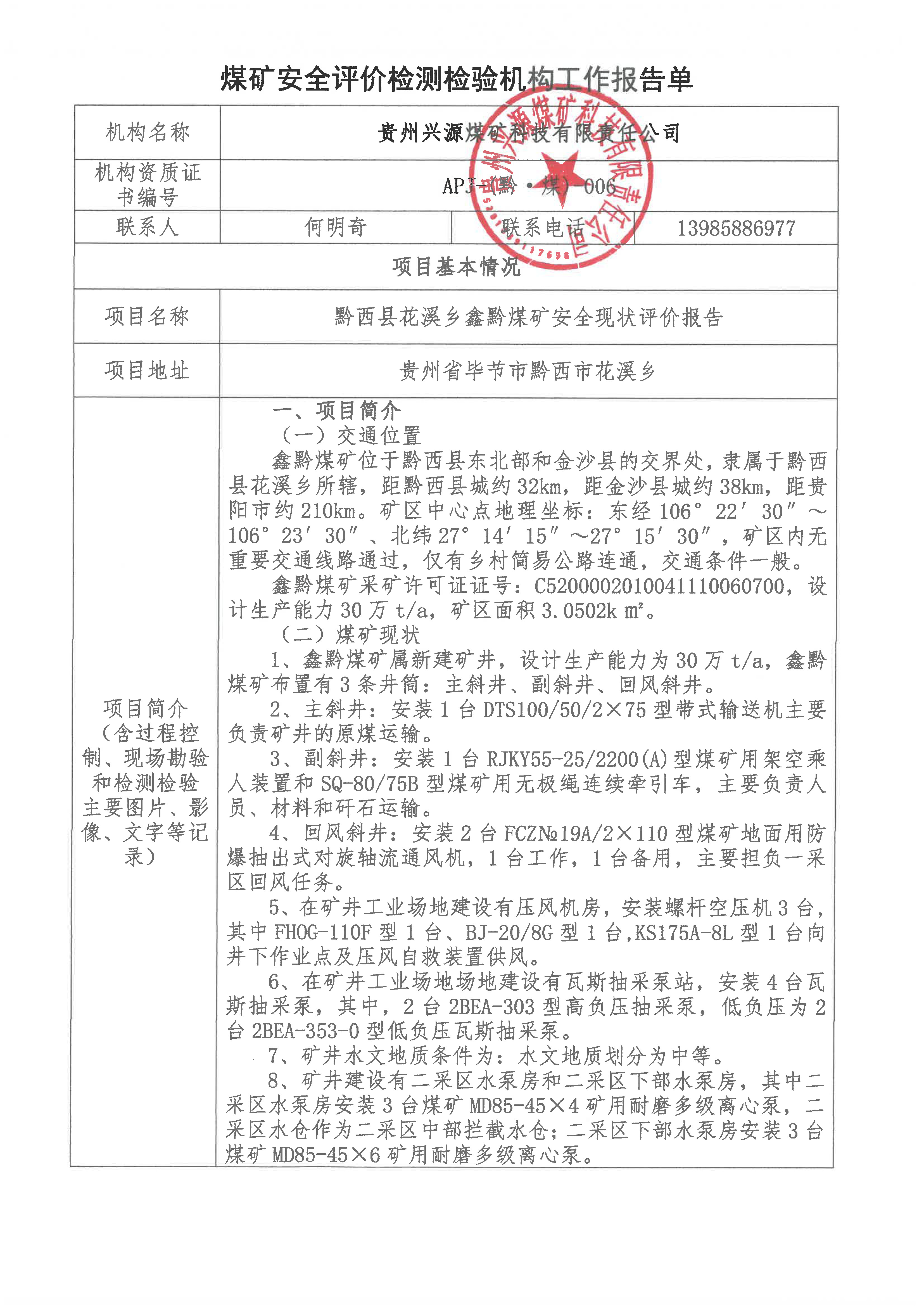 煤礦安全評(píng)價(jià)檢測(cè)檢驗(yàn)機(jī)構(gòu)工作報(bào)告單【黔西縣花溪鄉(xiāng)鑫黔煤礦安全現(xiàn)狀評(píng)價(jià)報(bào)告】