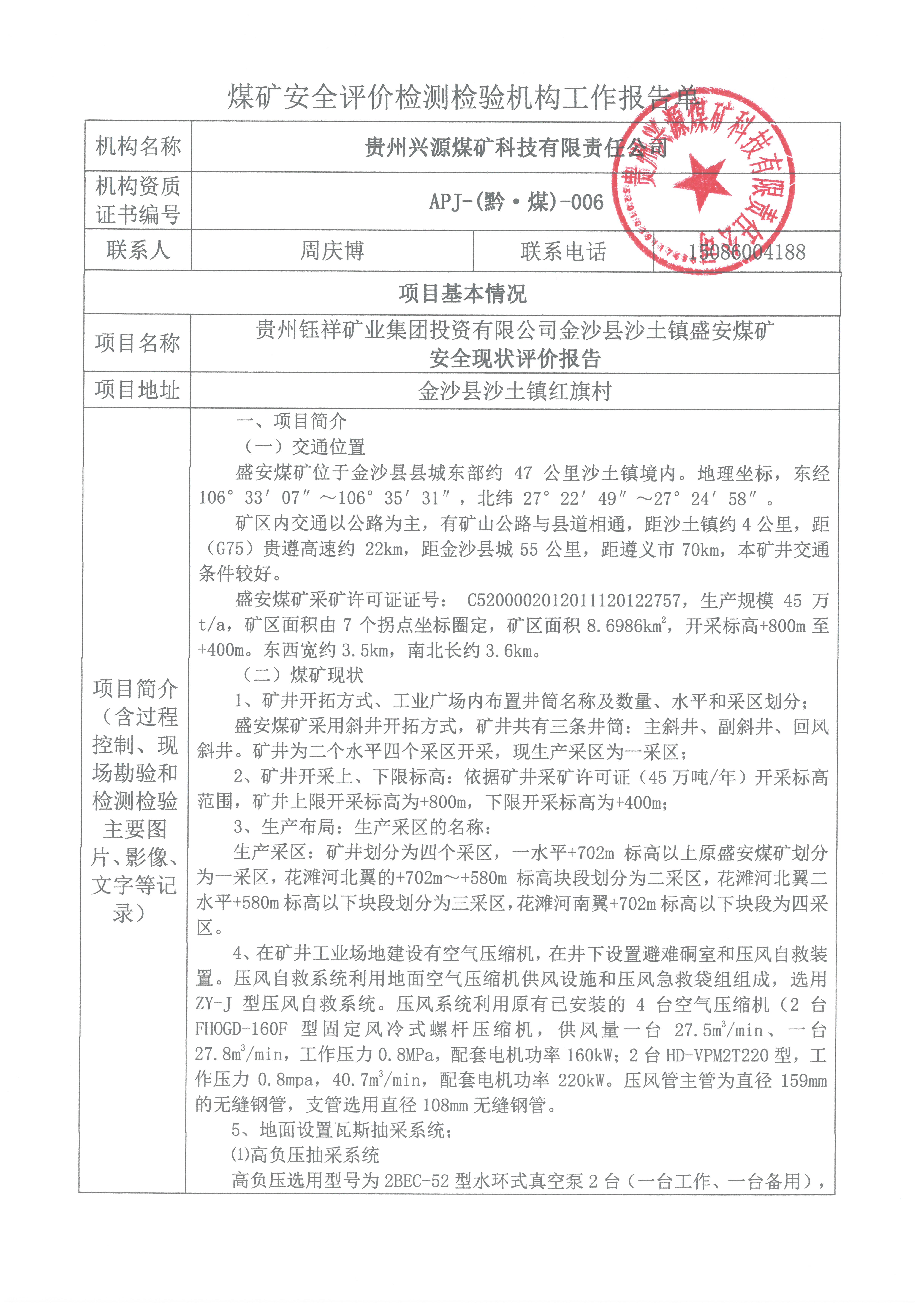 煤礦安全評(píng)價(jià)檢測(cè)檢驗(yàn)機(jī)構(gòu)工作報(bào)告單【貴州鈺祥礦業(yè)集團(tuán)投資有限公司金沙縣沙土鎮(zhèn)盛安煤礦 安全現(xiàn)狀評(píng)價(jià)報(bào)告】
