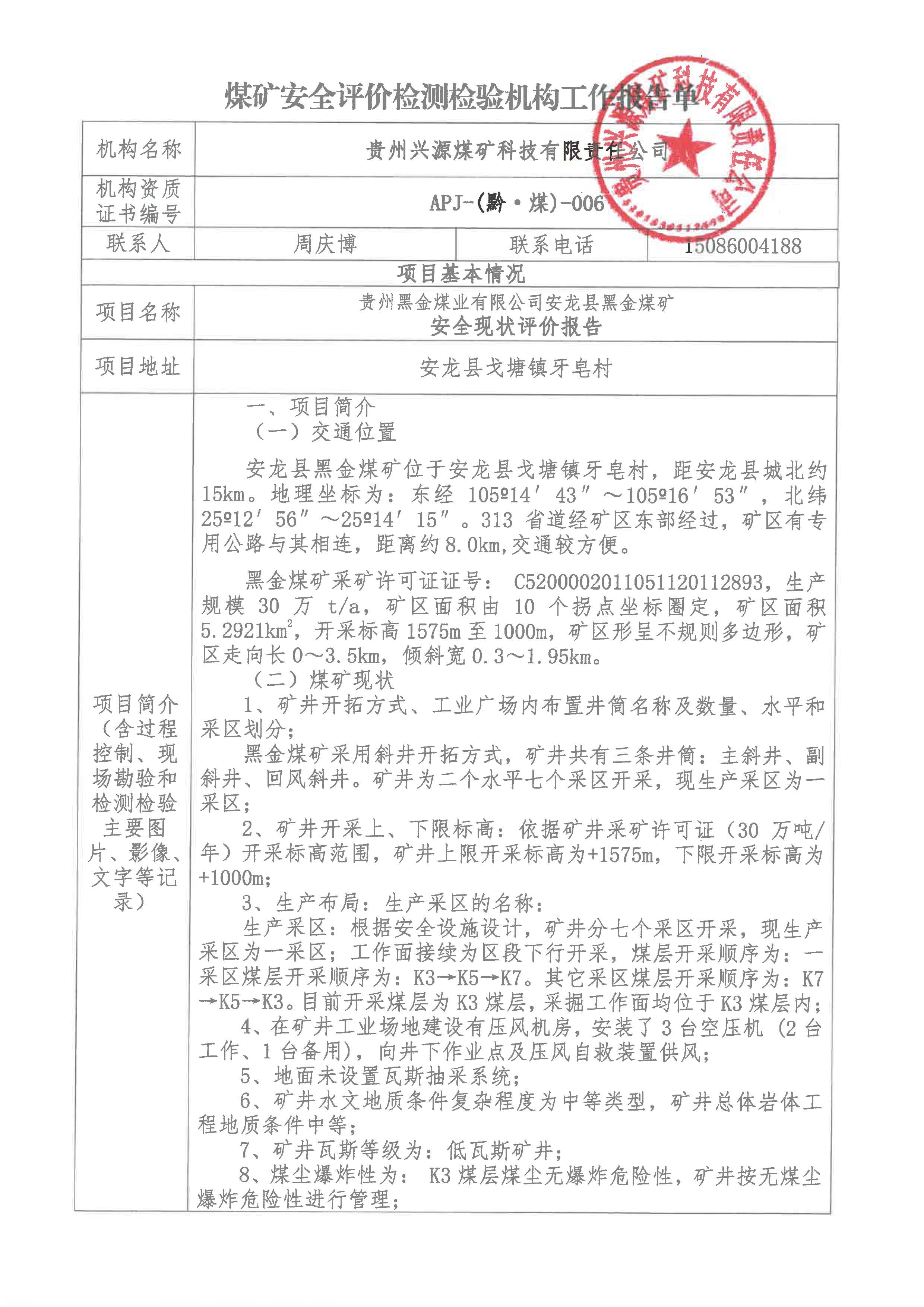 煤礦安全評(píng)價(jià)檢測(cè)檢驗(yàn)機(jī)構(gòu)工作報(bào)告單【貴州黑金煤業(yè)有限公司安龍縣黑金煤礦】