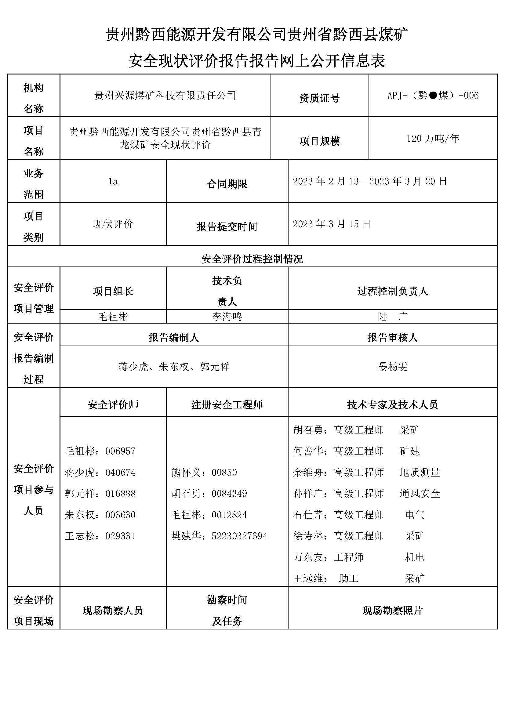 貴州黔西能源開發(fā)有限公司貴州省黔西縣煤礦安全現(xiàn)狀評價報告報告網(wǎng)上公開信息表