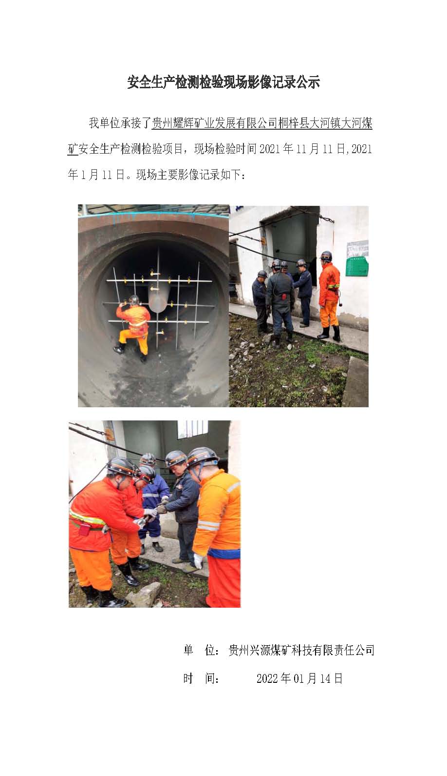 安全生產(chǎn)檢測(cè)檢驗(yàn)現(xiàn)場(chǎng)影像記錄公示【貴州耀輝礦業(yè)發(fā)展有限公司桐梓縣大河鎮(zhèn)大河煤礦】