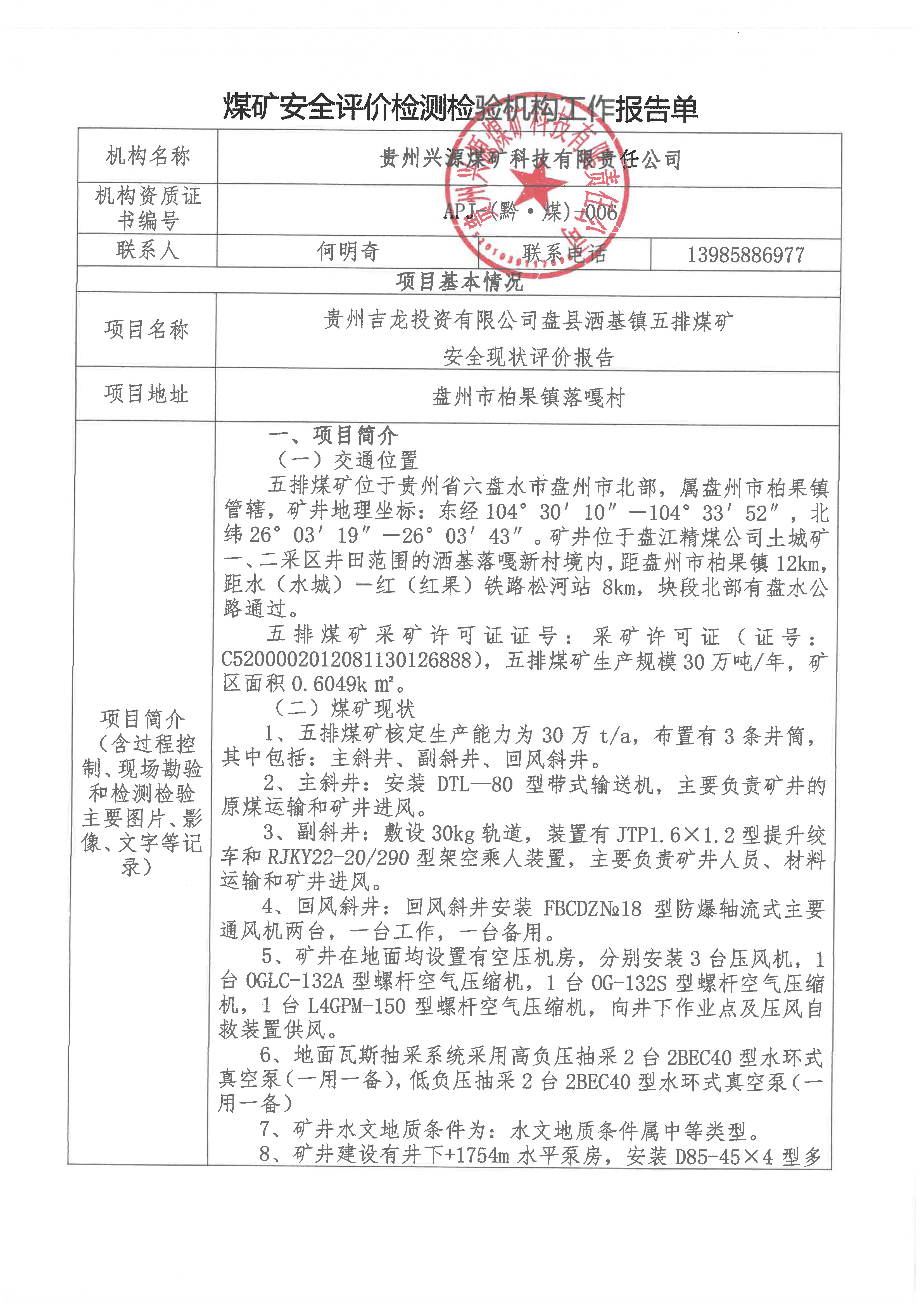 煤礦安全評(píng)價(jià)檢測(cè)檢驗(yàn)機(jī)構(gòu)工作報(bào)告單【貴州吉龍投資有限公司盤縣灑基鎮(zhèn)五排煤礦 安全現(xiàn)狀評(píng)價(jià)報(bào)告】