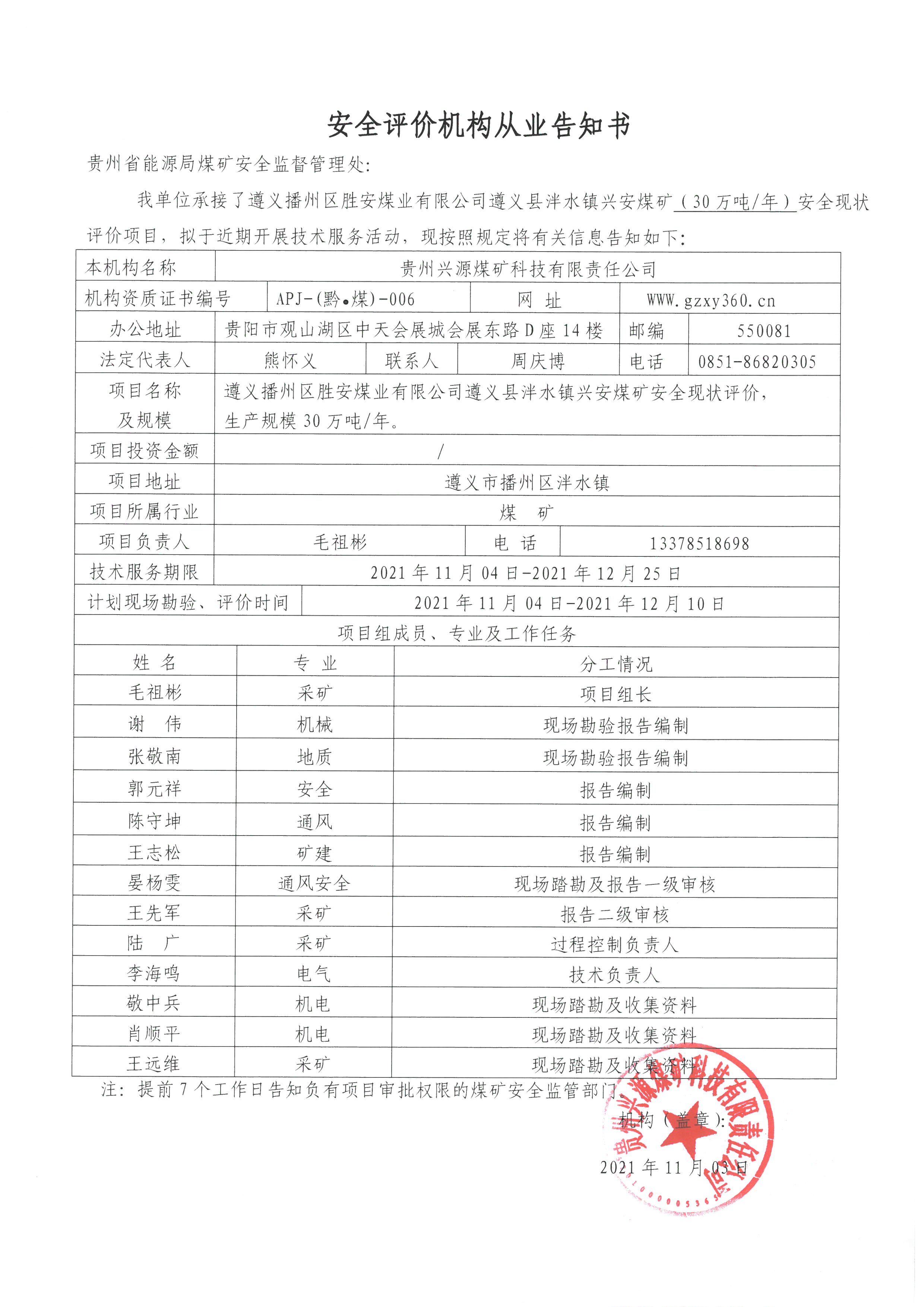安全評價機(jī)構(gòu)從業(yè)告知書(遵義播州區(qū)勝安煤業(yè)有限公司遵義縣泮水鎮(zhèn)興安煤礦(30萬噸/年)安全現(xiàn)狀評價)