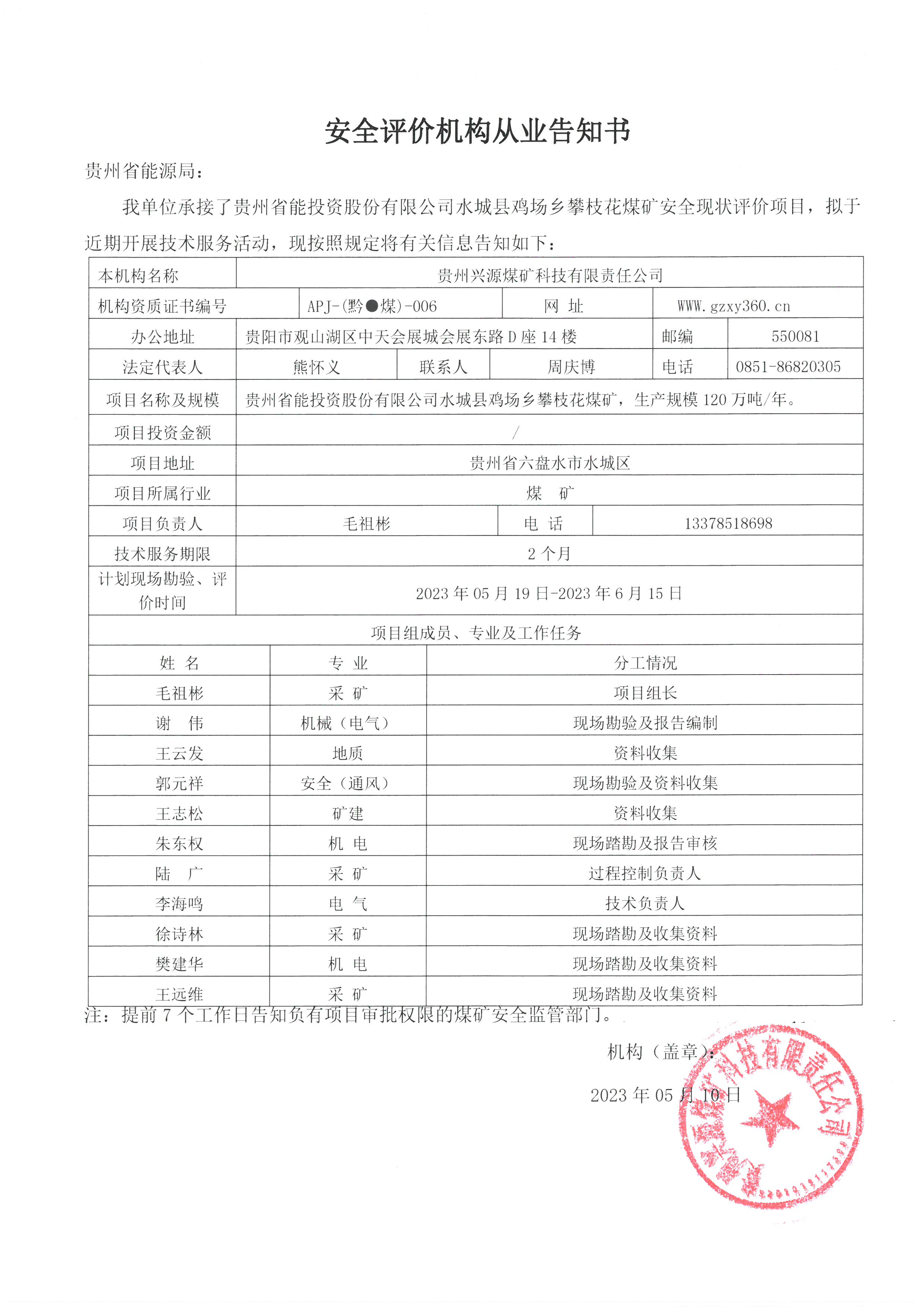 安全評(píng)價(jià)機(jī)構(gòu)從業(yè)告知書(shū)[貴州省能投資股份有限公司水城縣雞場(chǎng)鄉(xiāng)攀枝花煤礦安全現(xiàn)狀評(píng)價(jià)項(xiàng)目]