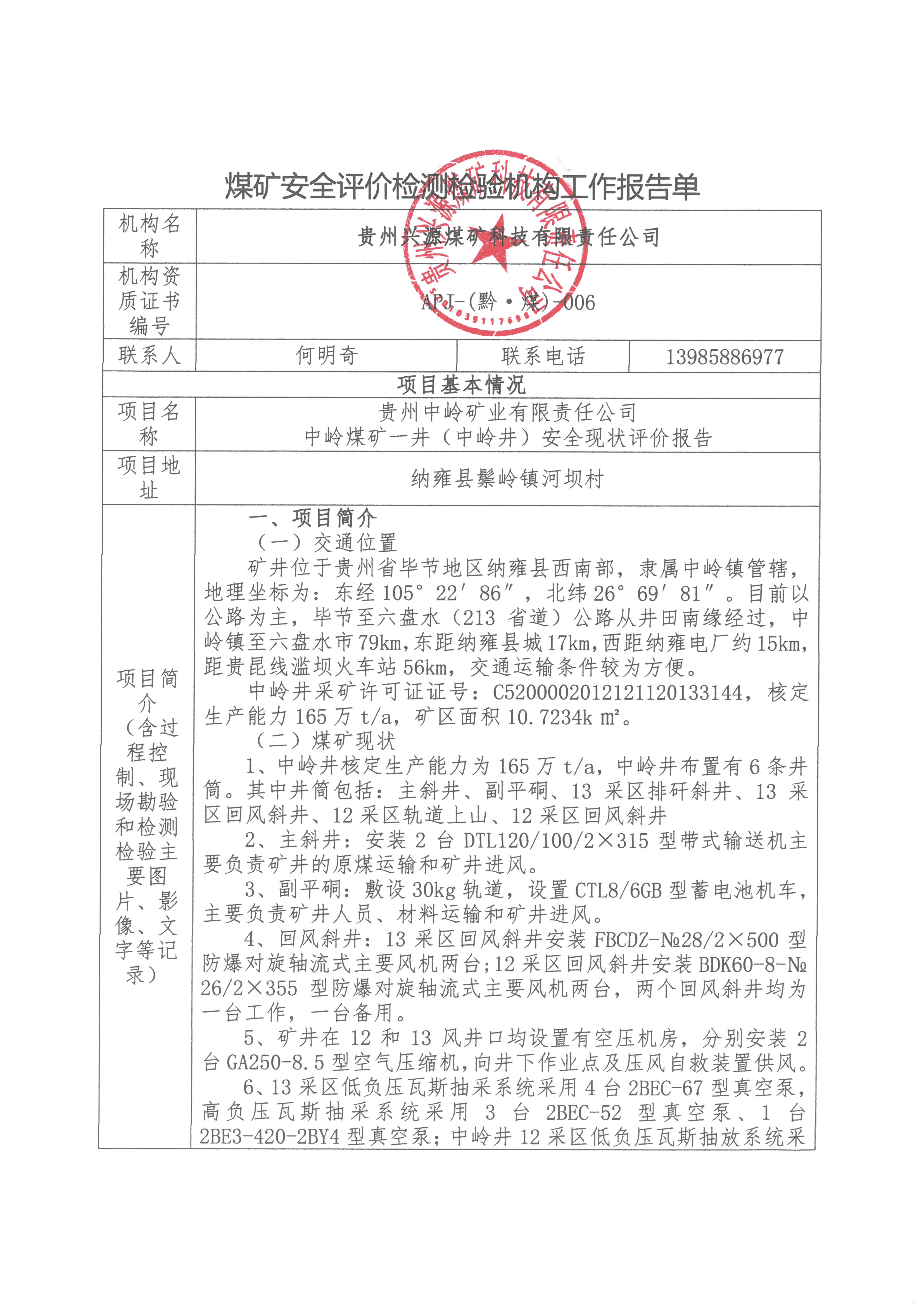煤礦安全評價檢測檢驗機構(gòu)工作報告單【貴州中嶺礦業(yè)有限責(zé)任公司中嶺煤礦一井(中嶺井)安全現(xiàn)狀評價報告】