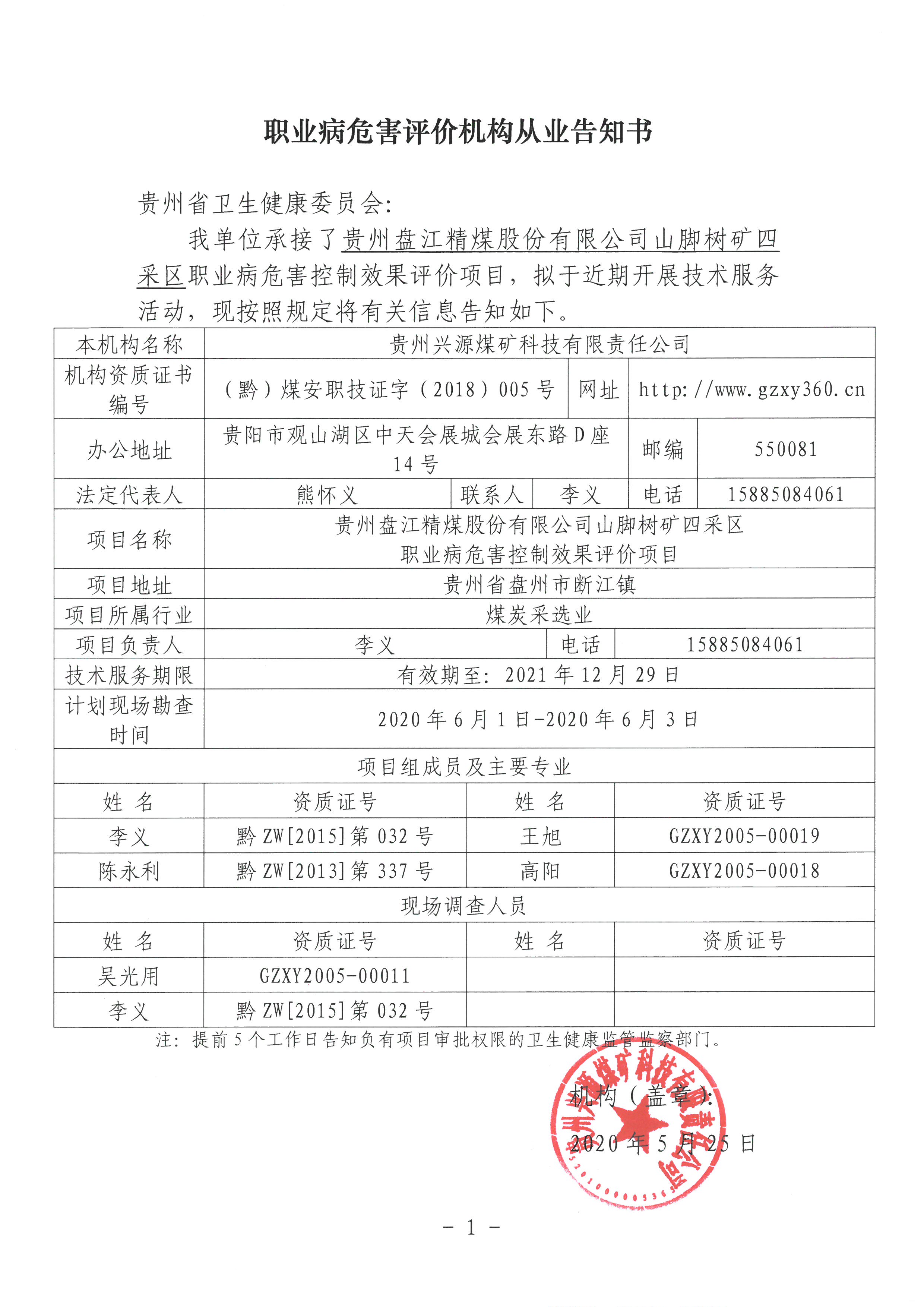 職業(yè)病危害評價機構從業(yè)告知書[貴州盤江精煤股份有限公司山腳樹煤礦四采區(qū)]
