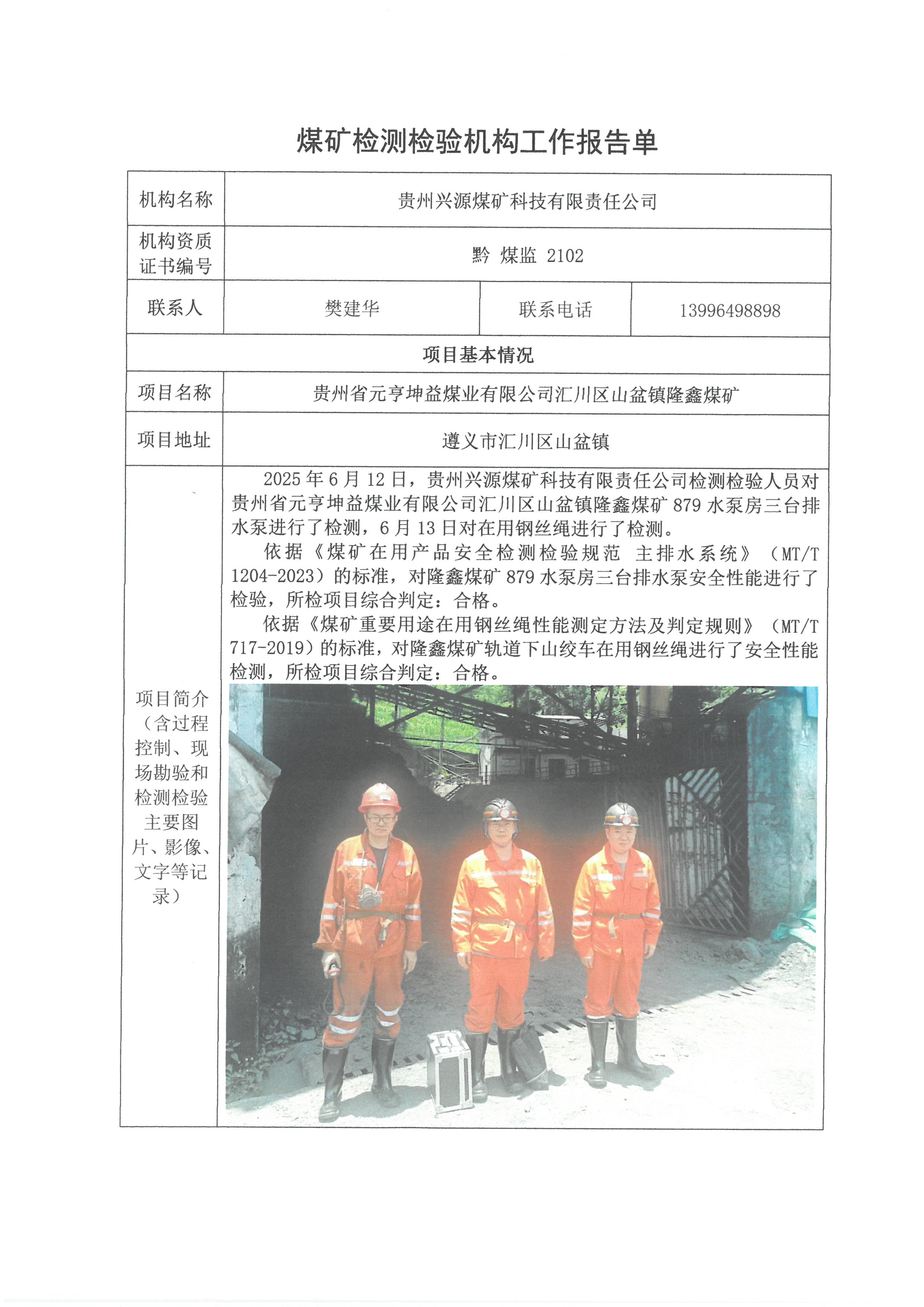 煤礦檢測檢驗機構工作報告單【貴州省元亨坤益煤業(yè)有限公司匯川區(qū)山盆鎮(zhèn)隆鑫煤礦】
