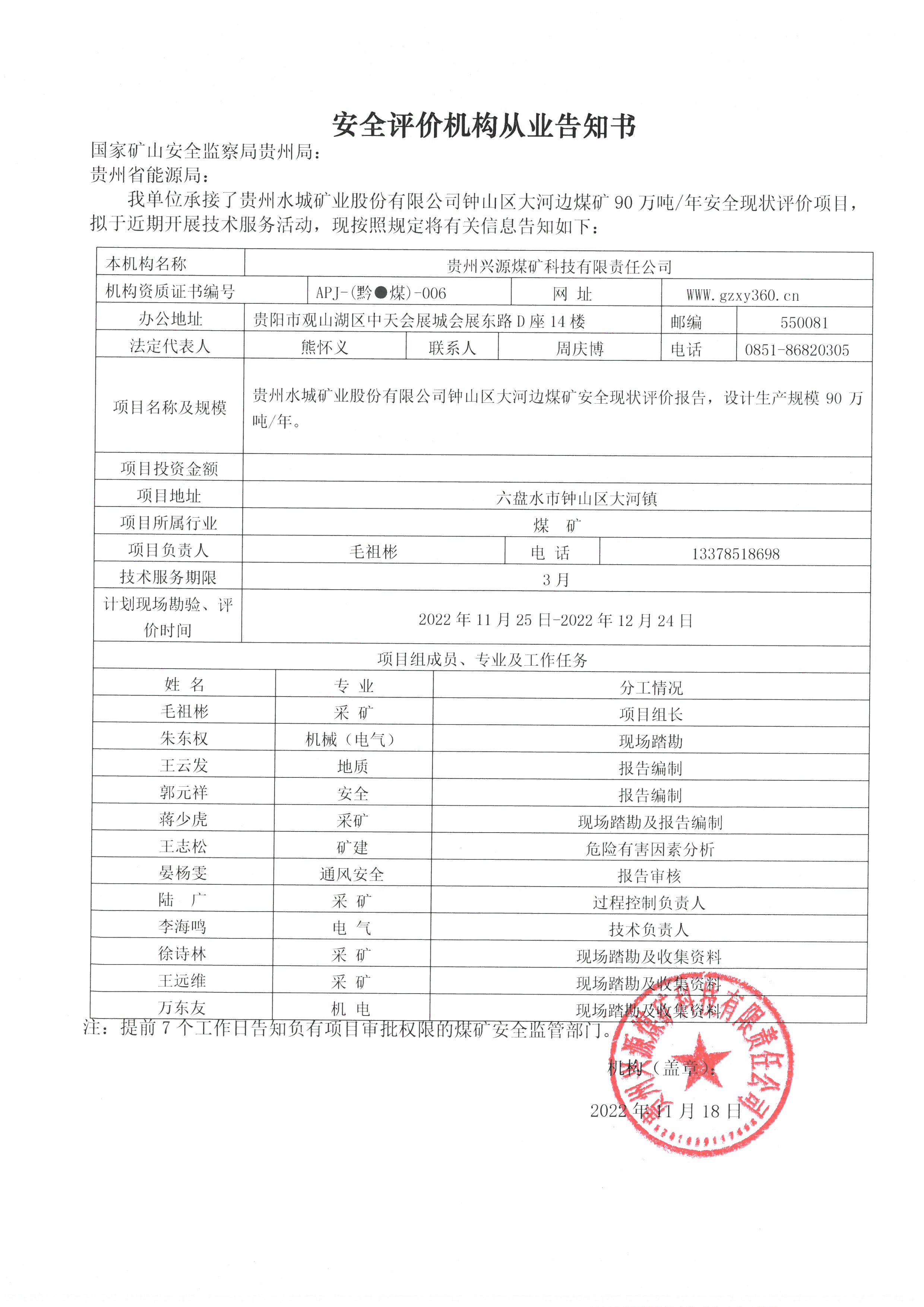 安全評價機(jī)構(gòu)從業(yè)告知書【貴州水城礦業(yè)股份有限公司鐘山區(qū)大河邊煤礦】