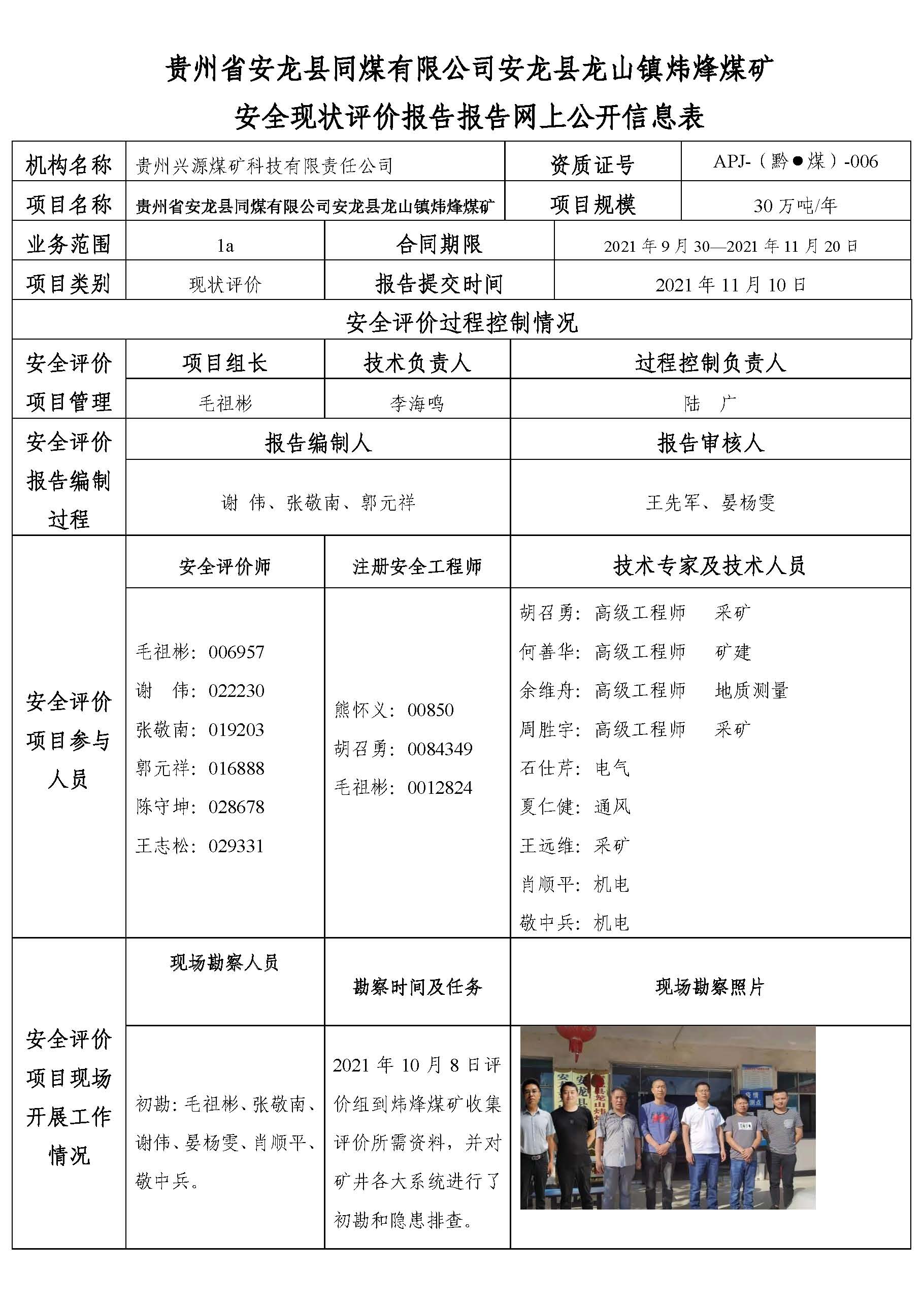 貴州省安龍縣同煤有限公司安龍縣龍山鎮(zhèn)煒烽煤礦 安全現(xiàn)狀評價報告報告網(wǎng)上公開信息表