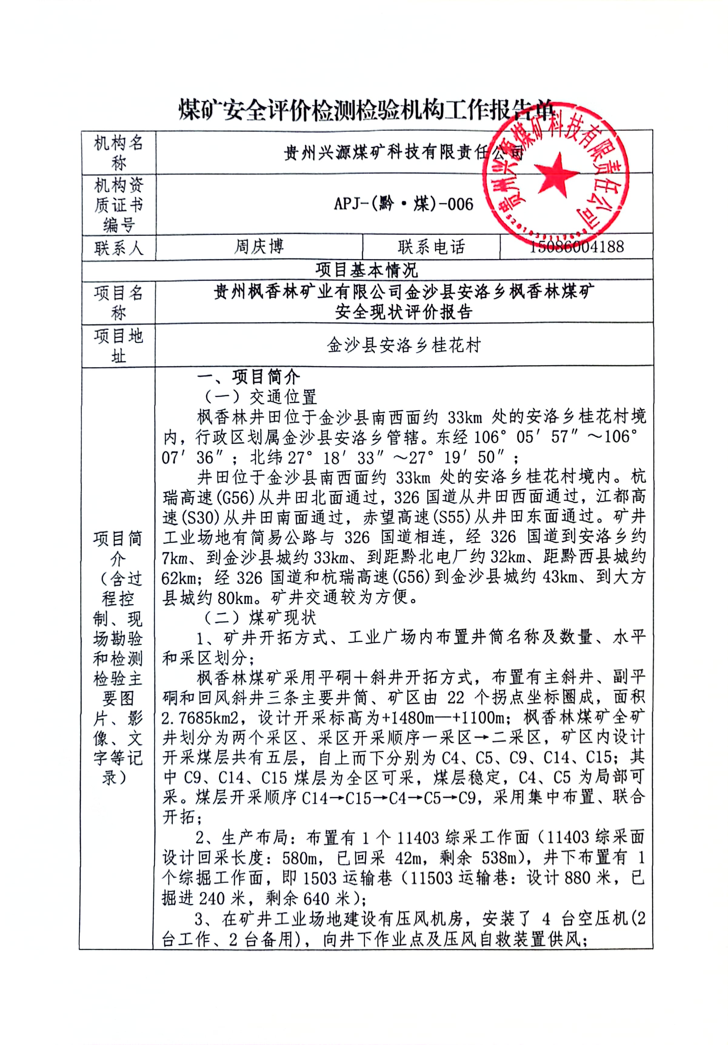 煤礦安全評價檢測檢驗機構(gòu)工作報告單【貴州楓香林礦業(yè)有限公司 金沙縣安洛鄉(xiāng)楓香林煤礦 安全現(xiàn)狀評價報告】