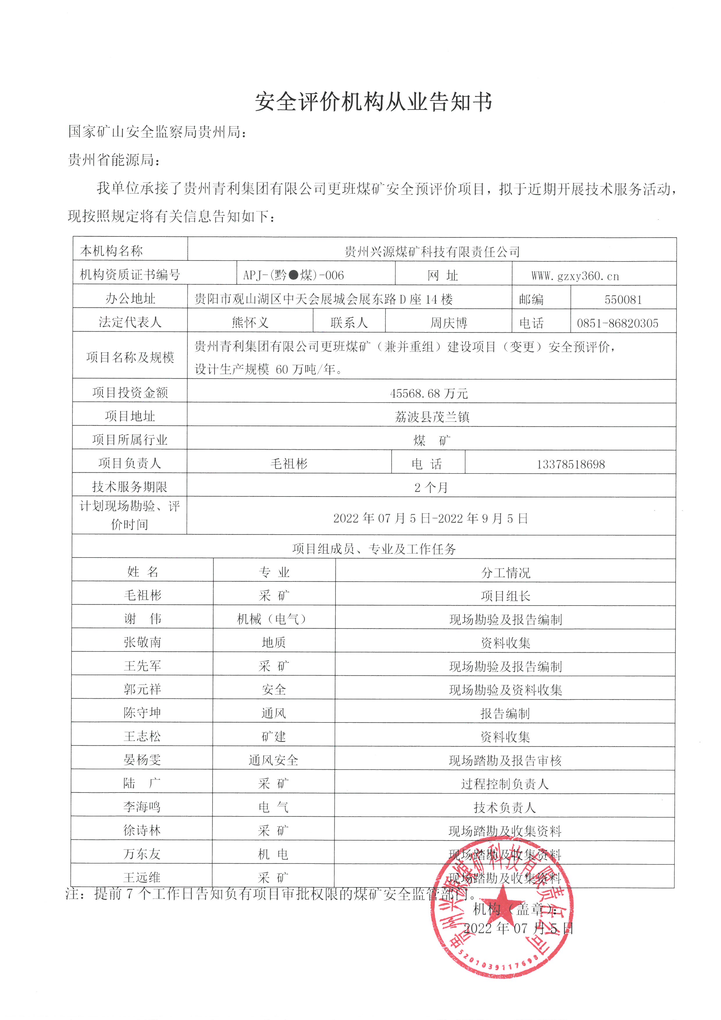 安全評價機構從業(yè)告知書【貴州青利集團有限公司更班煤礦】