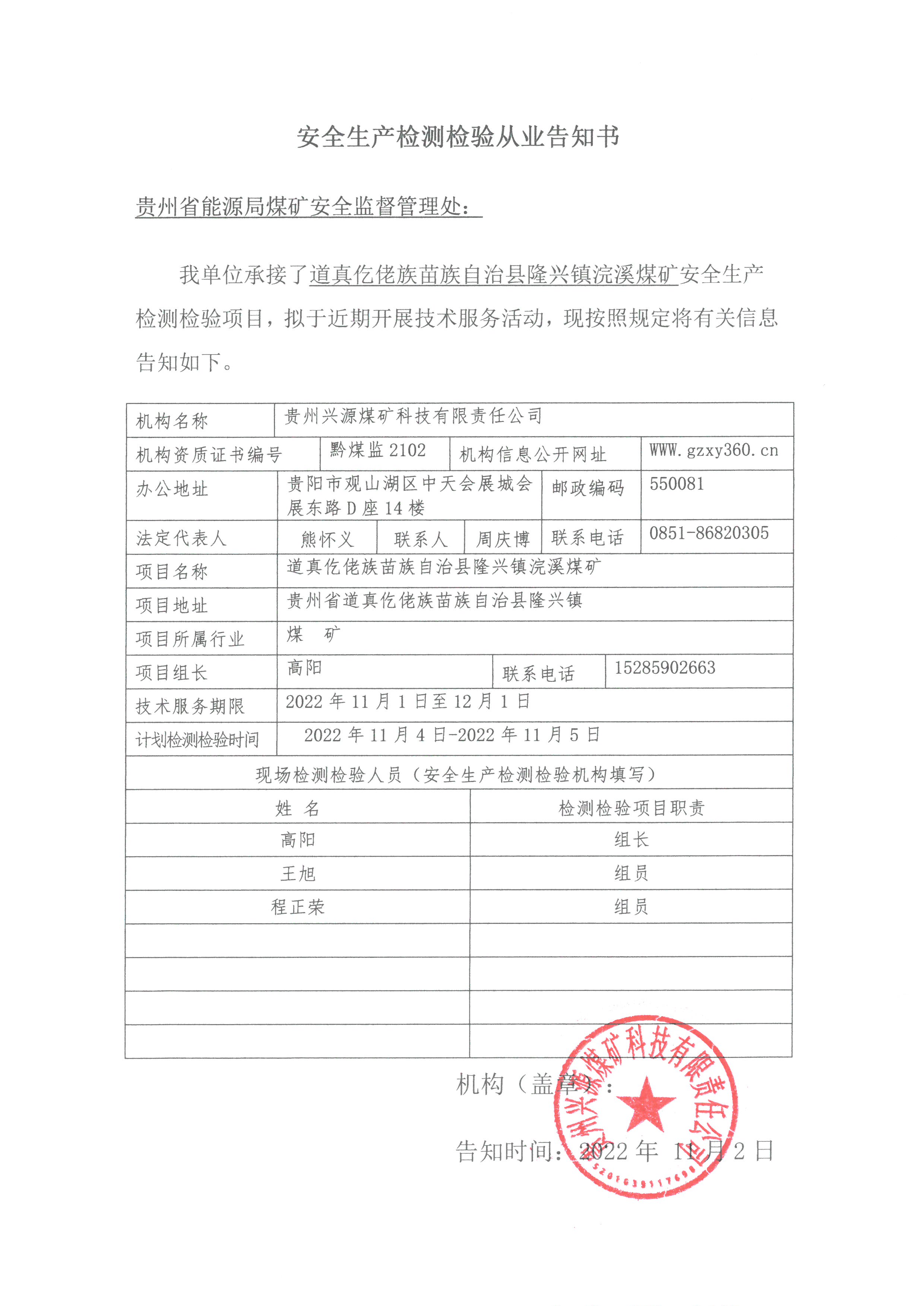 安全生產(chǎn)檢測檢驗從業(yè)告知書【道真仡佬族苗族自治縣隆興鎮(zhèn)浣溪煤礦安全生產(chǎn)檢測檢驗項目】