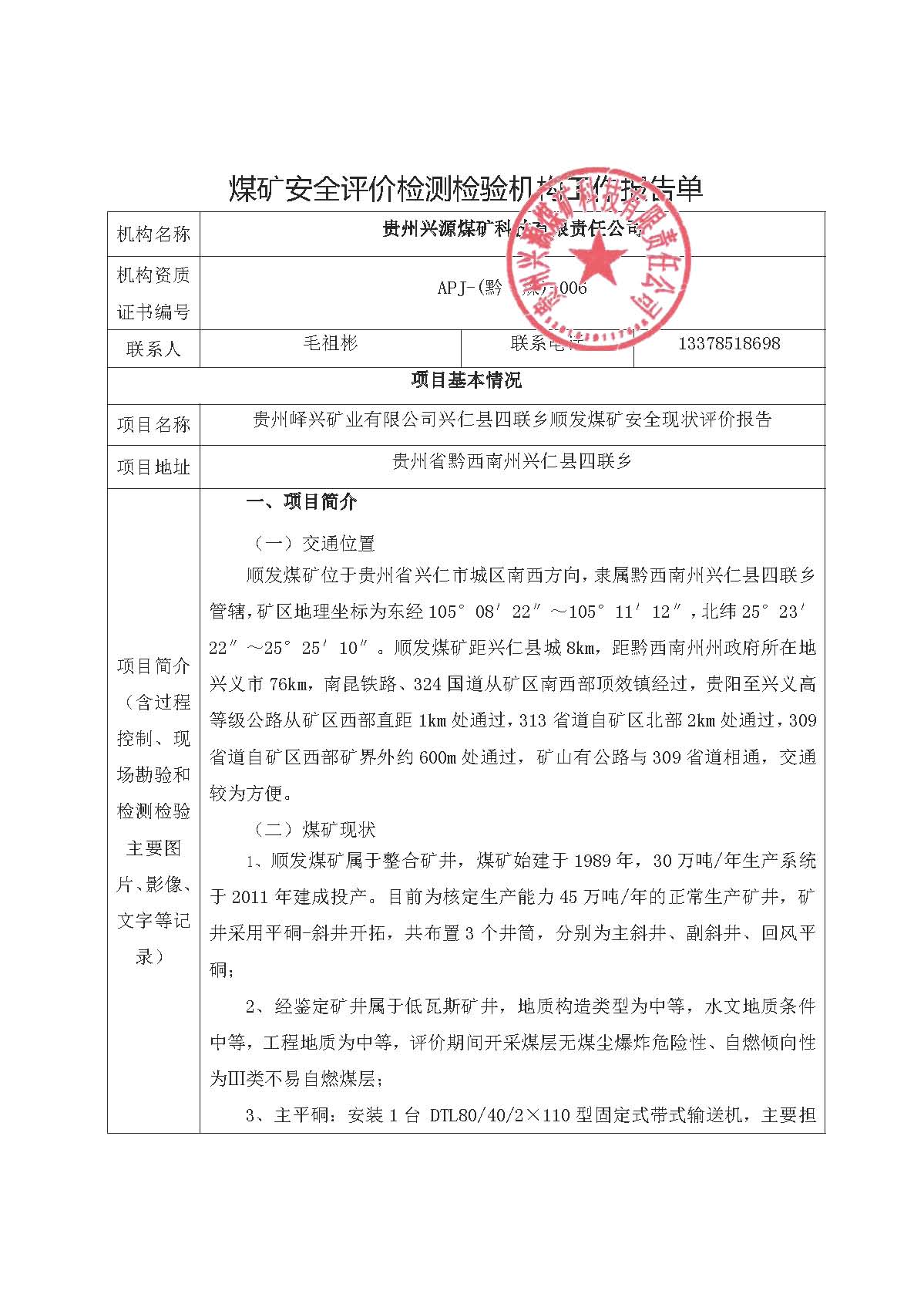 煤礦安全評價檢測檢驗機構(gòu)工作報告單【貴州嶧興礦業(yè)有限公司興仁縣四聯(lián)鄉(xiāng)順發(fā)煤礦安全現(xiàn)狀評價報告】