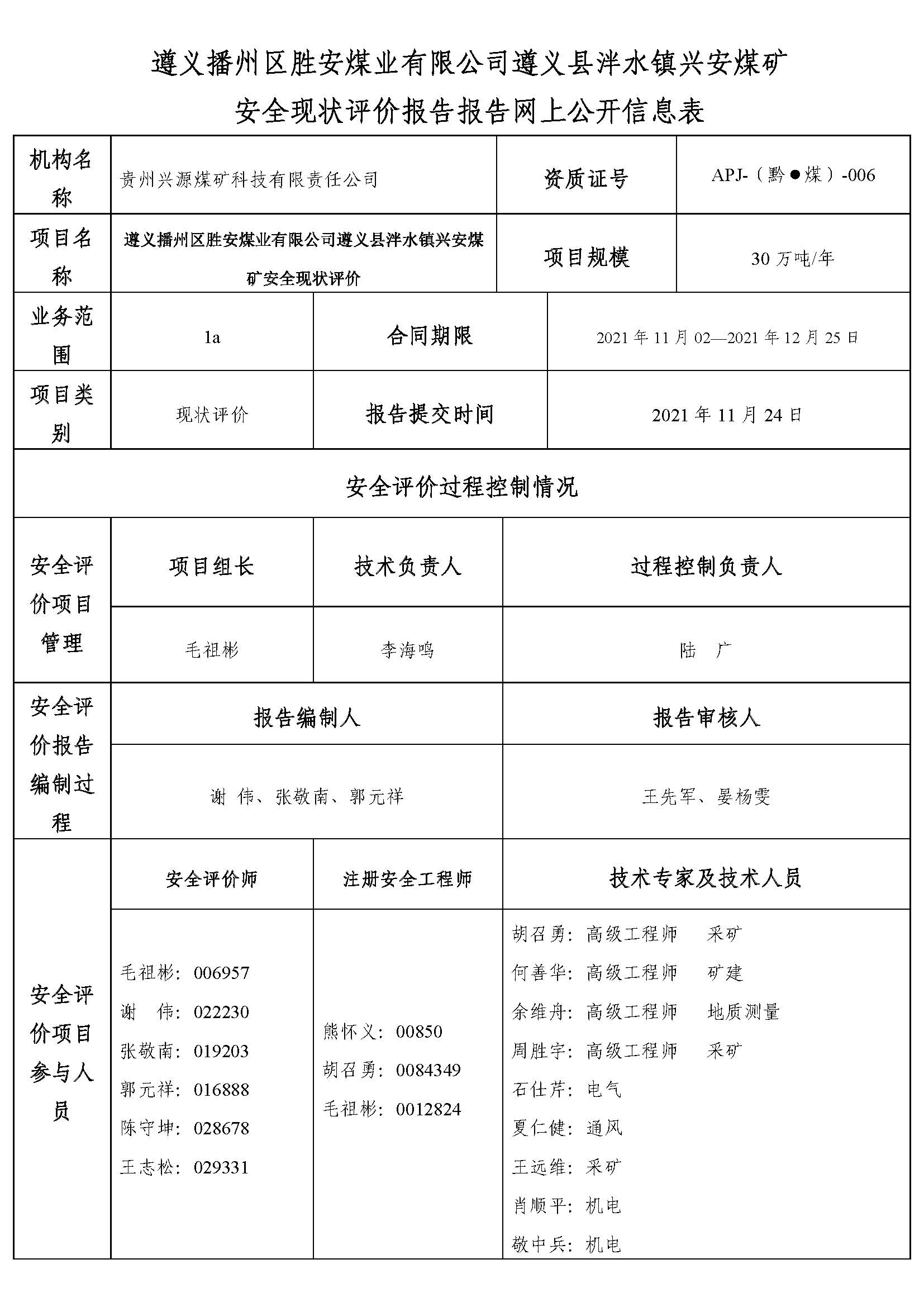 遵義播州區(qū)勝安煤業(yè)有限公司遵義縣泮水鎮(zhèn)興安煤礦 安全現(xiàn)狀評(píng)價(jià)報(bào)告報(bào)告網(wǎng)上公開信息表