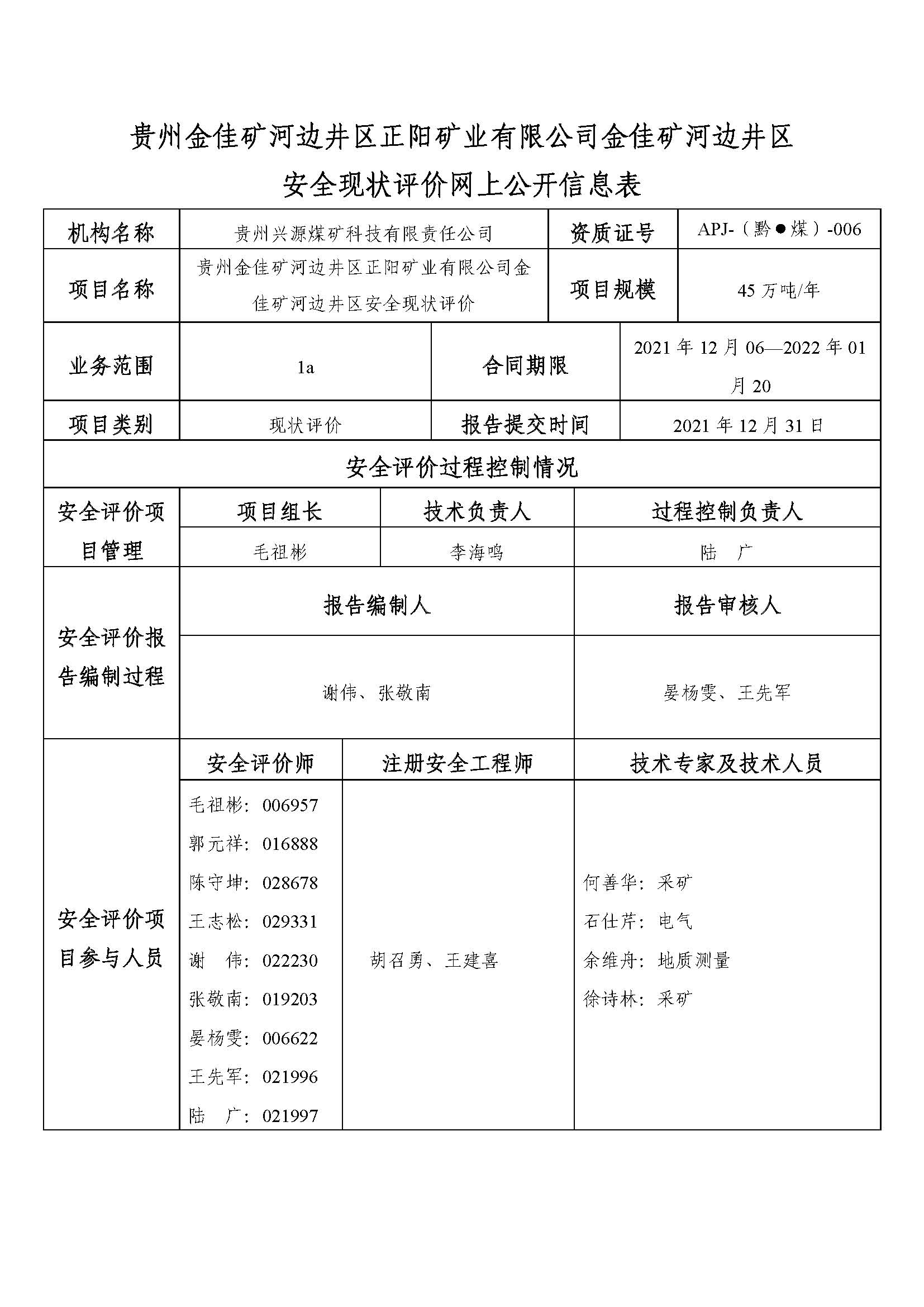 貴州金佳礦河邊井區(qū)正陽礦業(yè)有限公司金佳礦河邊井區(qū)安全現(xiàn)狀評(píng)價(jià)網(wǎng)上公開信息表