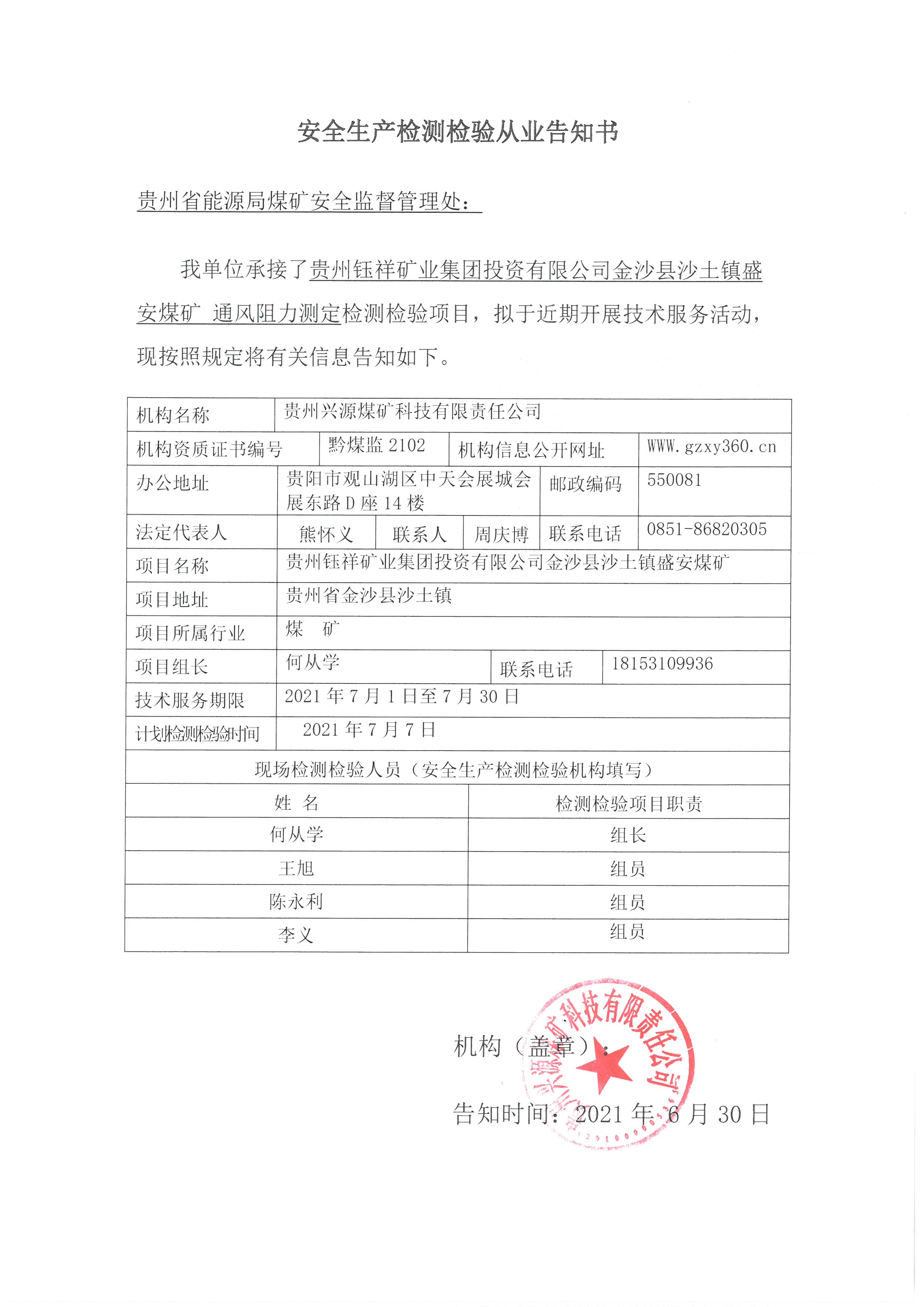 安全生產(chǎn)檢測檢驗(yàn)從業(yè)告知書【貴州鈺祥礦業(yè)集團(tuán)投資有限公司金沙縣沙土鎮(zhèn)盛安煤礦】