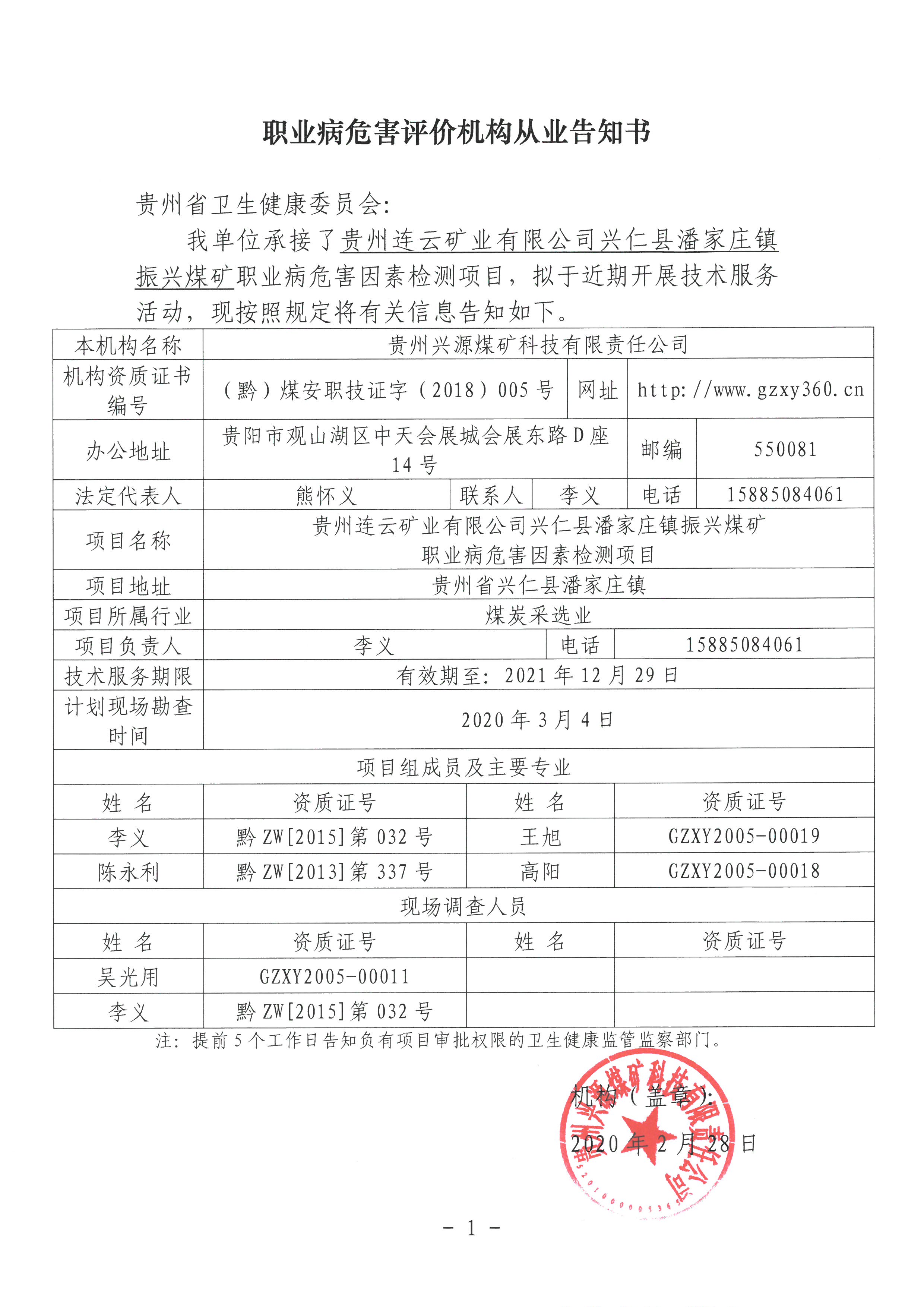 職業(yè)病危害評價機構從業(yè)告知書[貴州連云礦業(yè)有限公司興仁縣潘家莊鎮(zhèn)振興煤礦]