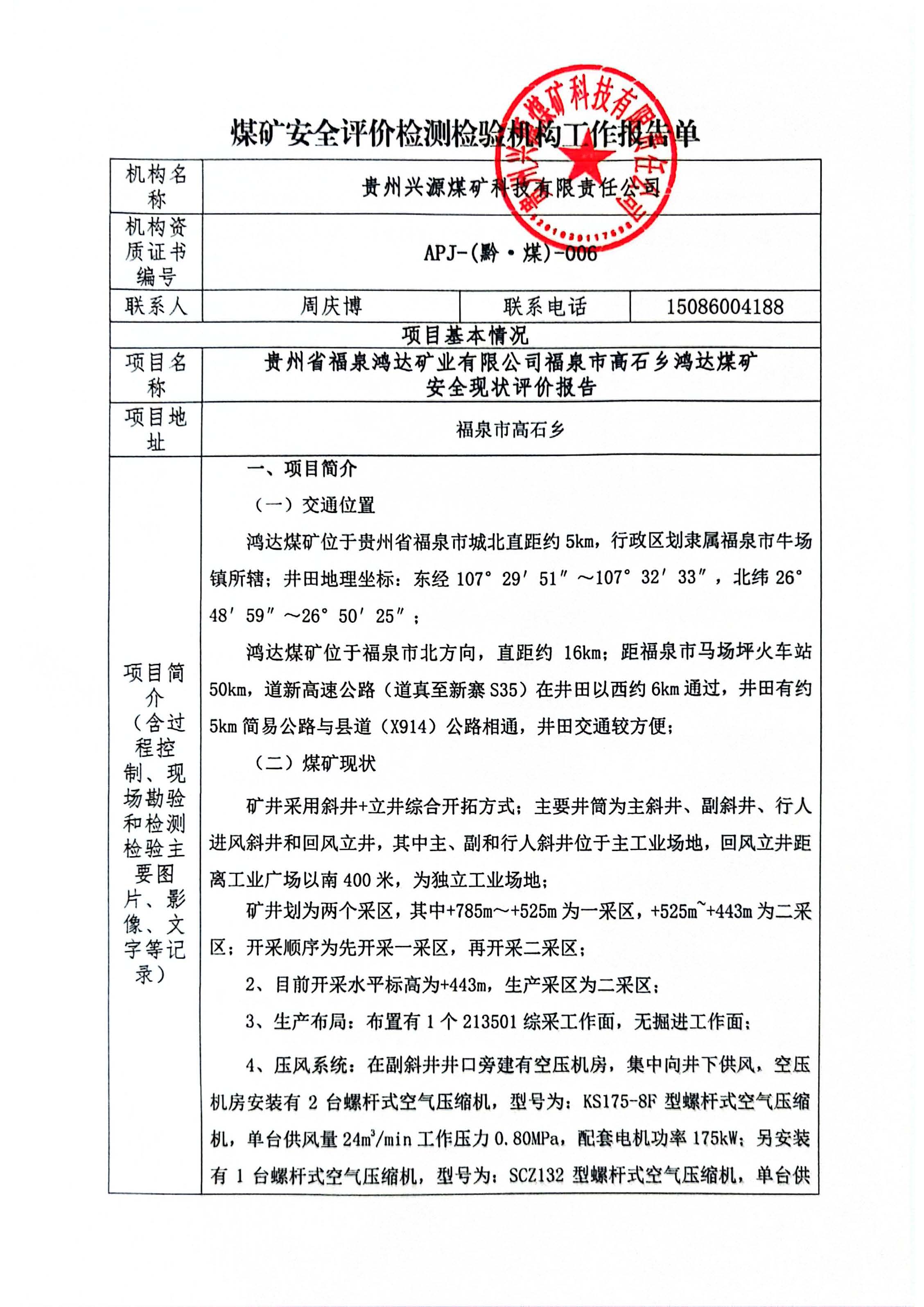 煤礦安全評價檢測檢驗機構(gòu)工作報告單[貴州省福泉鴻達礦業(yè)有限公司福泉市高石鄉(xiāng)鴻達煤礦 安全現(xiàn)狀評價報告]
