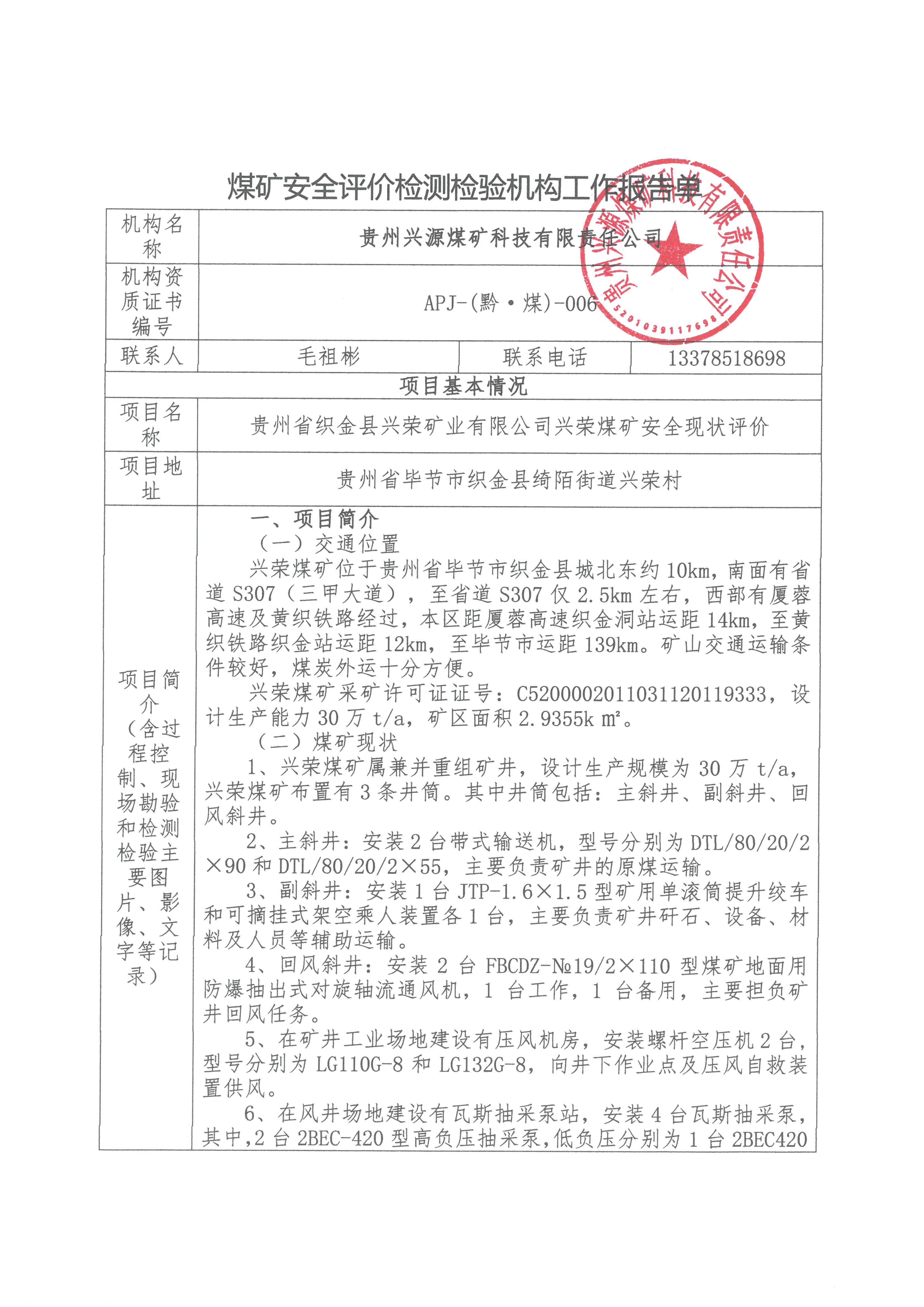 煤礦安全評價(jià)檢測檢驗(yàn)機(jī)構(gòu)工作報(bào)告單【貴州省織金縣興榮礦業(yè)有限公司興榮煤礦安全現(xiàn)狀評價(jià)】