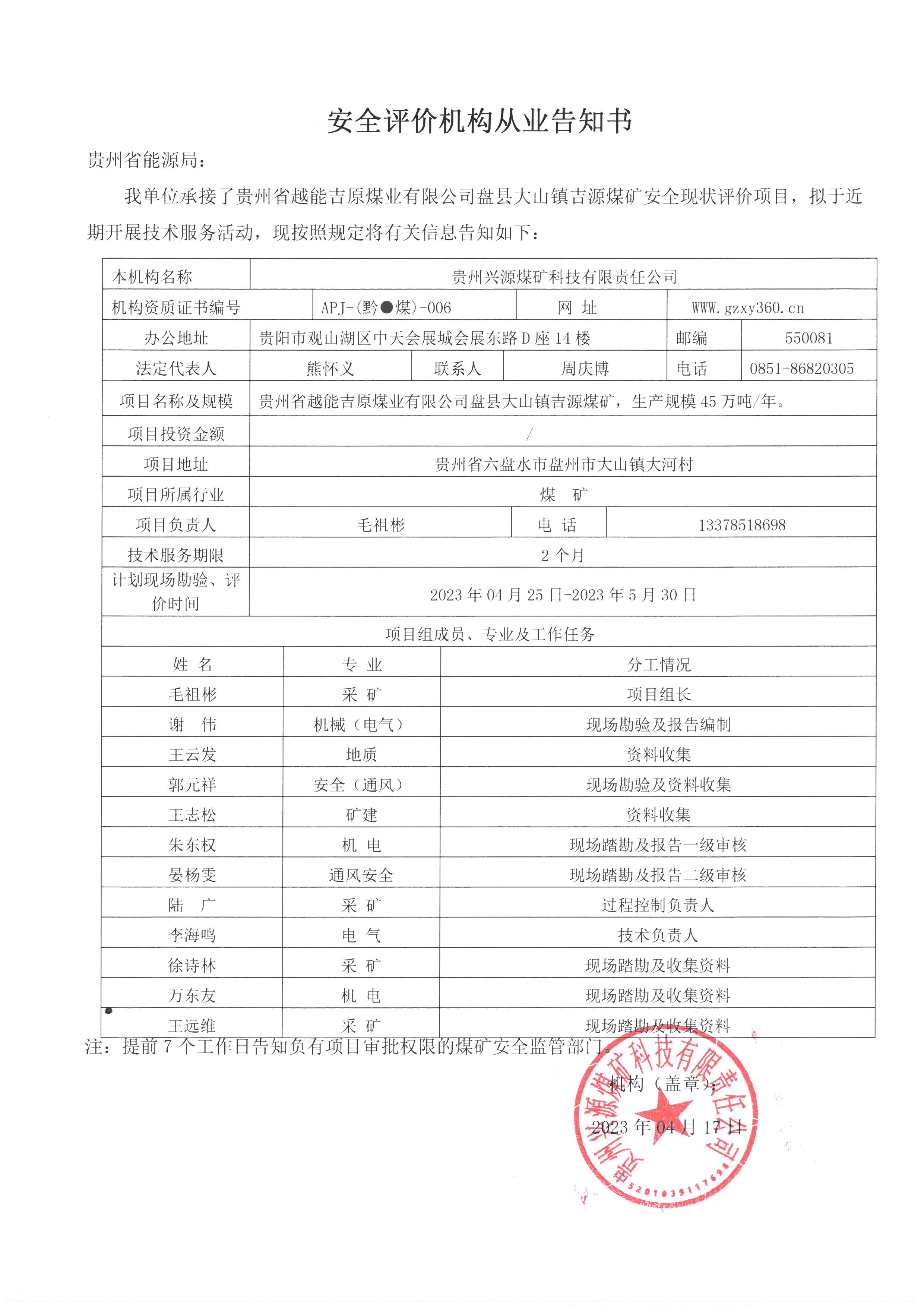 煤礦安全評(píng)價(jià)機(jī)構(gòu)從業(yè)告知書【貴州強(qiáng)盛集團(tuán)投資有限公司西秀區(qū)蔡官鎮(zhèn)宏發(fā)煤礦】