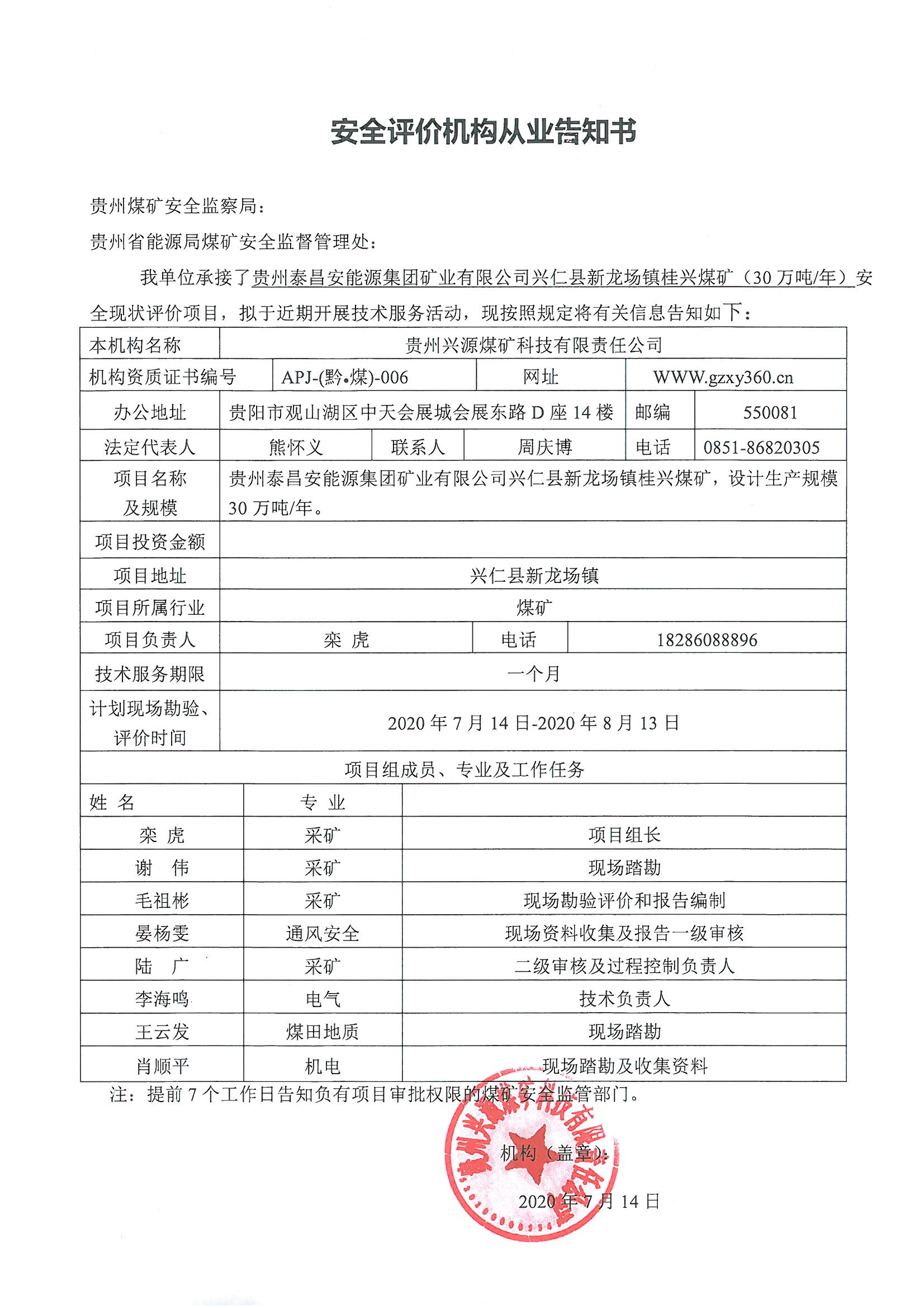 安全評(píng)價(jià)機(jī)構(gòu)從業(yè)告知書(shū)(貴州泰昌安能源集團(tuán)礦業(yè)有限公司興仁縣新龍場(chǎng)鎮(zhèn)桂興煤礦)