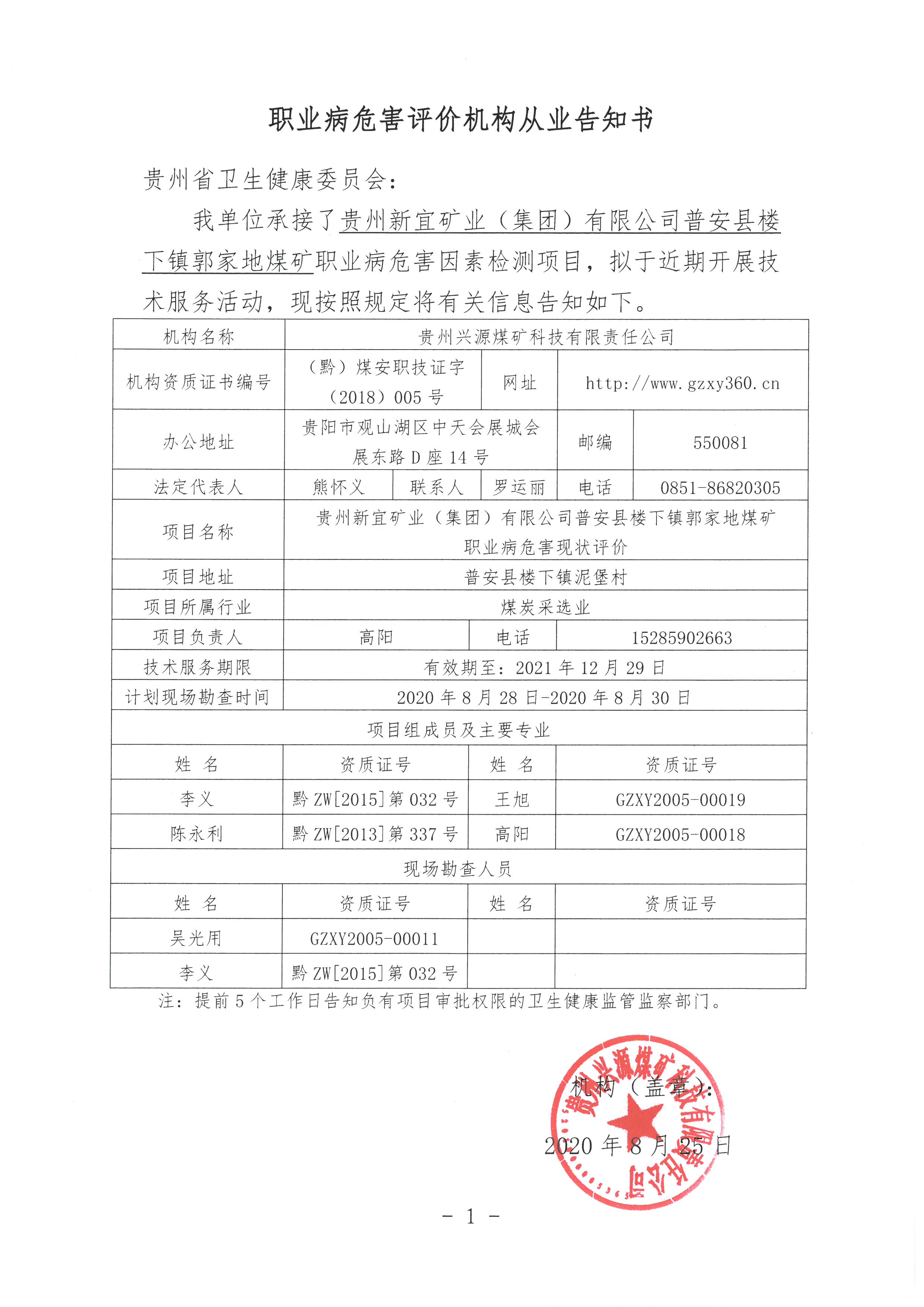 職業(yè)病危害評(píng)價(jià)機(jī)構(gòu)從業(yè)告知書(shū)【貴州新宜礦業(yè)(集團(tuán))有限公司普安縣樓下鎮(zhèn)郭家地煤礦】