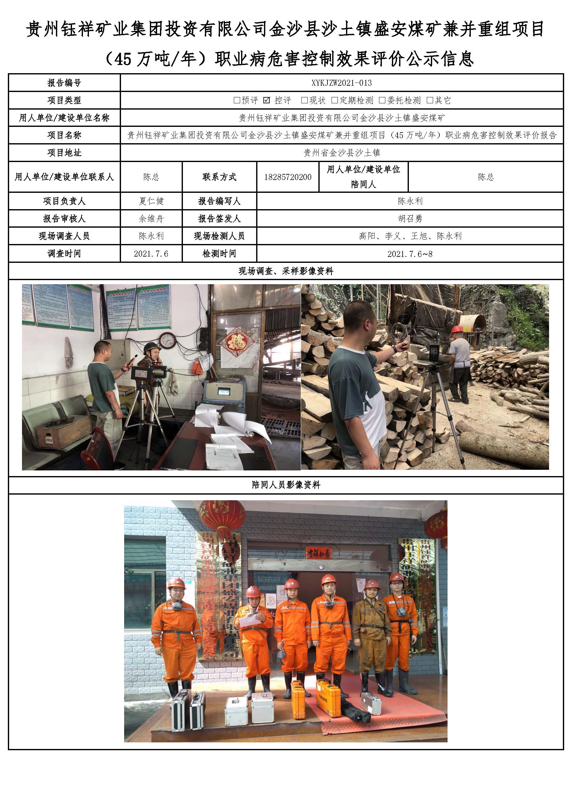 貴州鈺祥礦業(yè)集團(tuán)投資有限公司金沙縣沙土鎮(zhèn)盛安煤礦兼并重組項(xiàng)目(45萬(wàn)噸/年)職業(yè)病危害控制效果評(píng)價(jià)公示信息