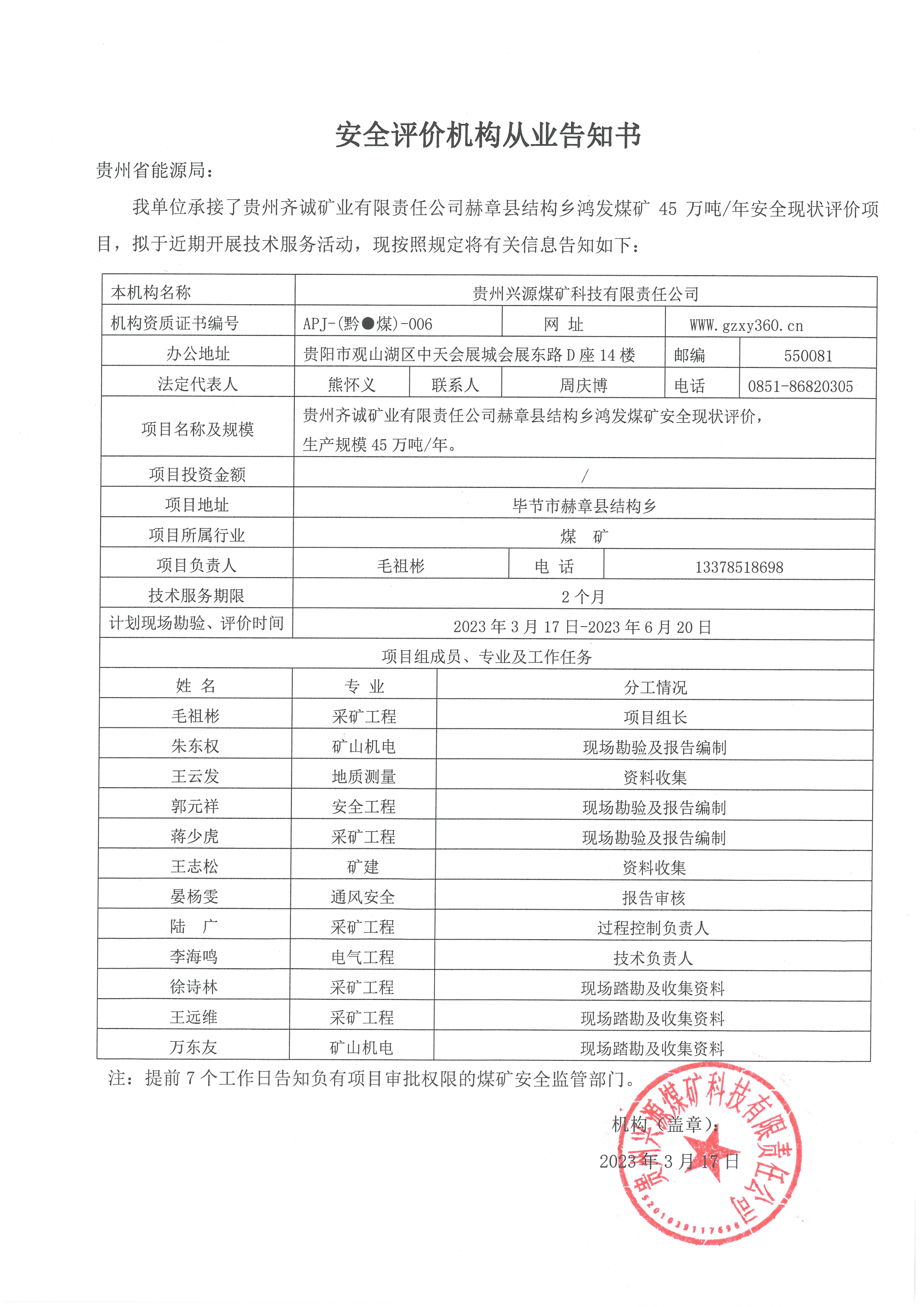 安全評價機構從業(yè)告知書【貴州齊誠礦業(yè)有限責任公司赫章縣結構鄉(xiāng)鴻發(fā)煤礦】
