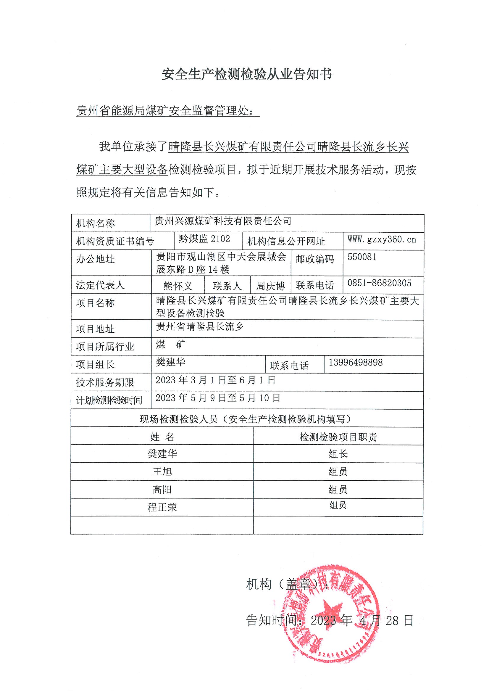 安全生產(chǎn)檢測(cè)檢驗(yàn)從業(yè)告知書【晴隆縣長(zhǎng)興煤礦有限責(zé)任公司晴隆縣長(zhǎng)流鄉(xiāng)長(zhǎng)興煤礦】