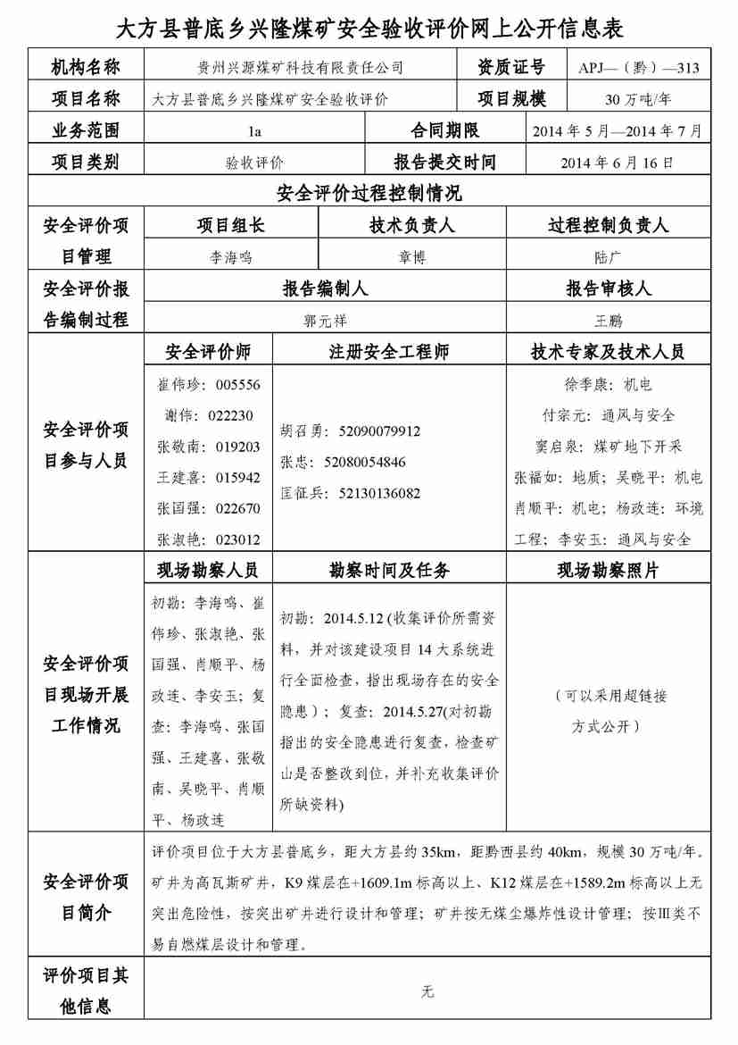 大方縣普底鄉(xiāng)興隆煤礦安全評價業(yè)務(wù)網(wǎng)上公開信息表