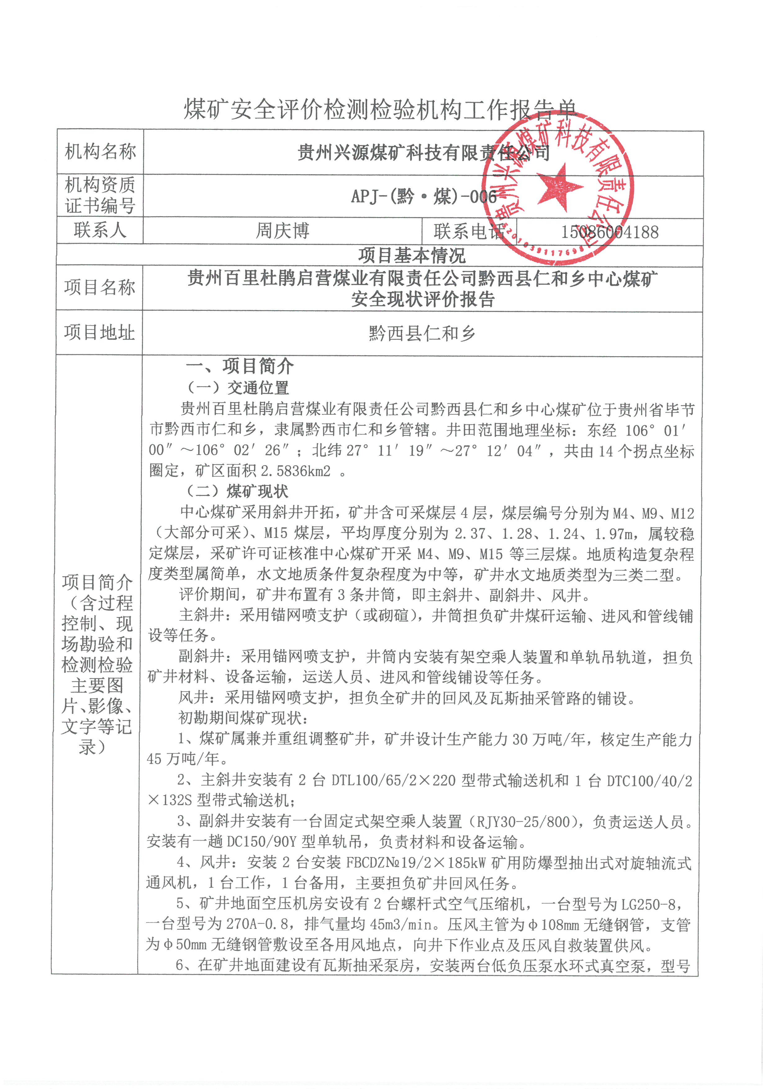 煤礦安全評(píng)價(jià)檢測(cè)檢驗(yàn)機(jī)構(gòu)工作報(bào)告單【貴州百里杜鵑啟營(yíng)煤業(yè)有限責(zé)任公司黔西縣仁和鄉(xiāng)中心煤礦安全現(xiàn)狀評(píng)價(jià)報(bào)告】