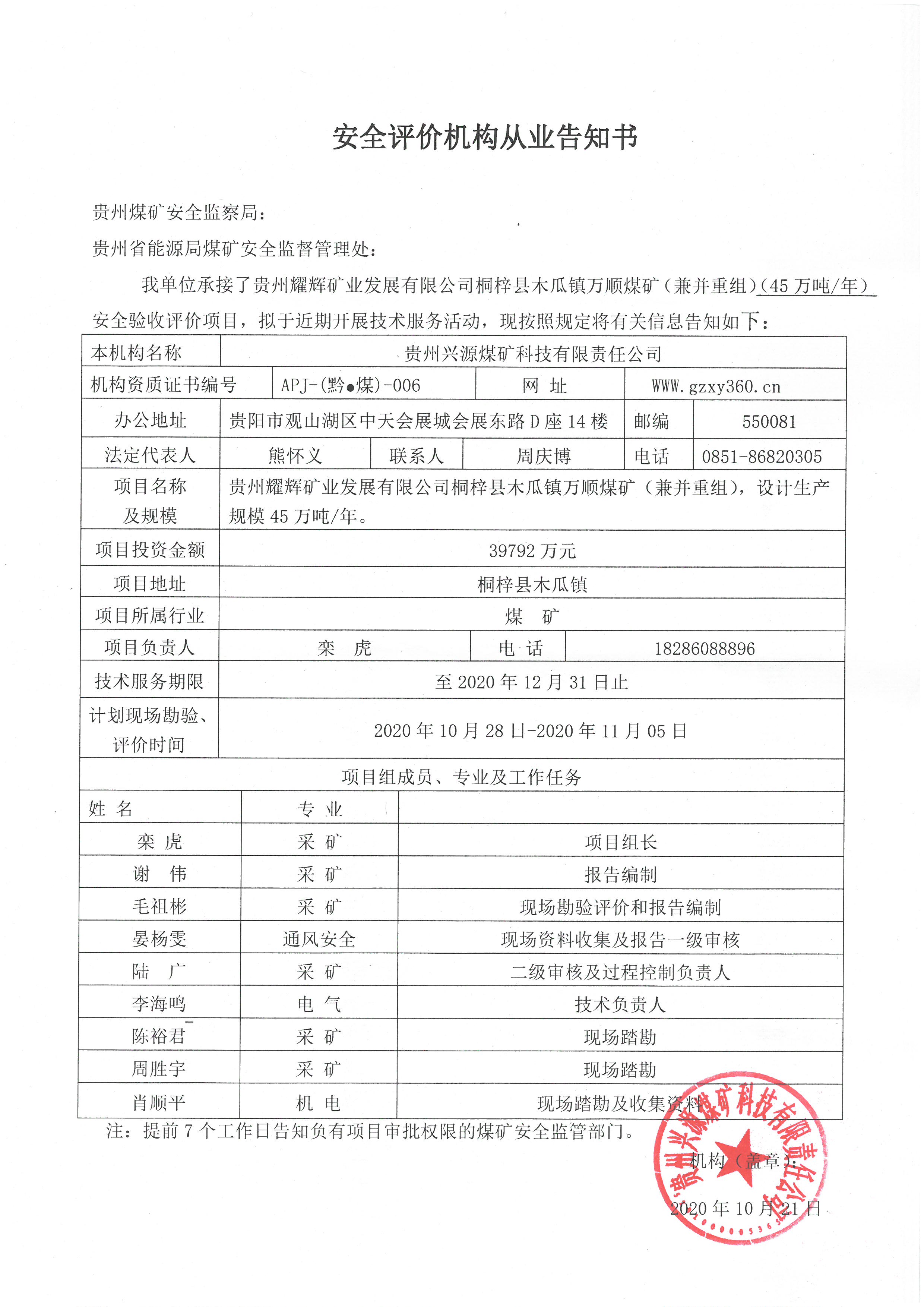 安全評(píng)價(jià)機(jī)構(gòu)從業(yè)告知書(shū)(貴州耀輝礦業(yè)發(fā)展有限公司桐梓縣木瓜鎮(zhèn)萬(wàn)順煤礦)
