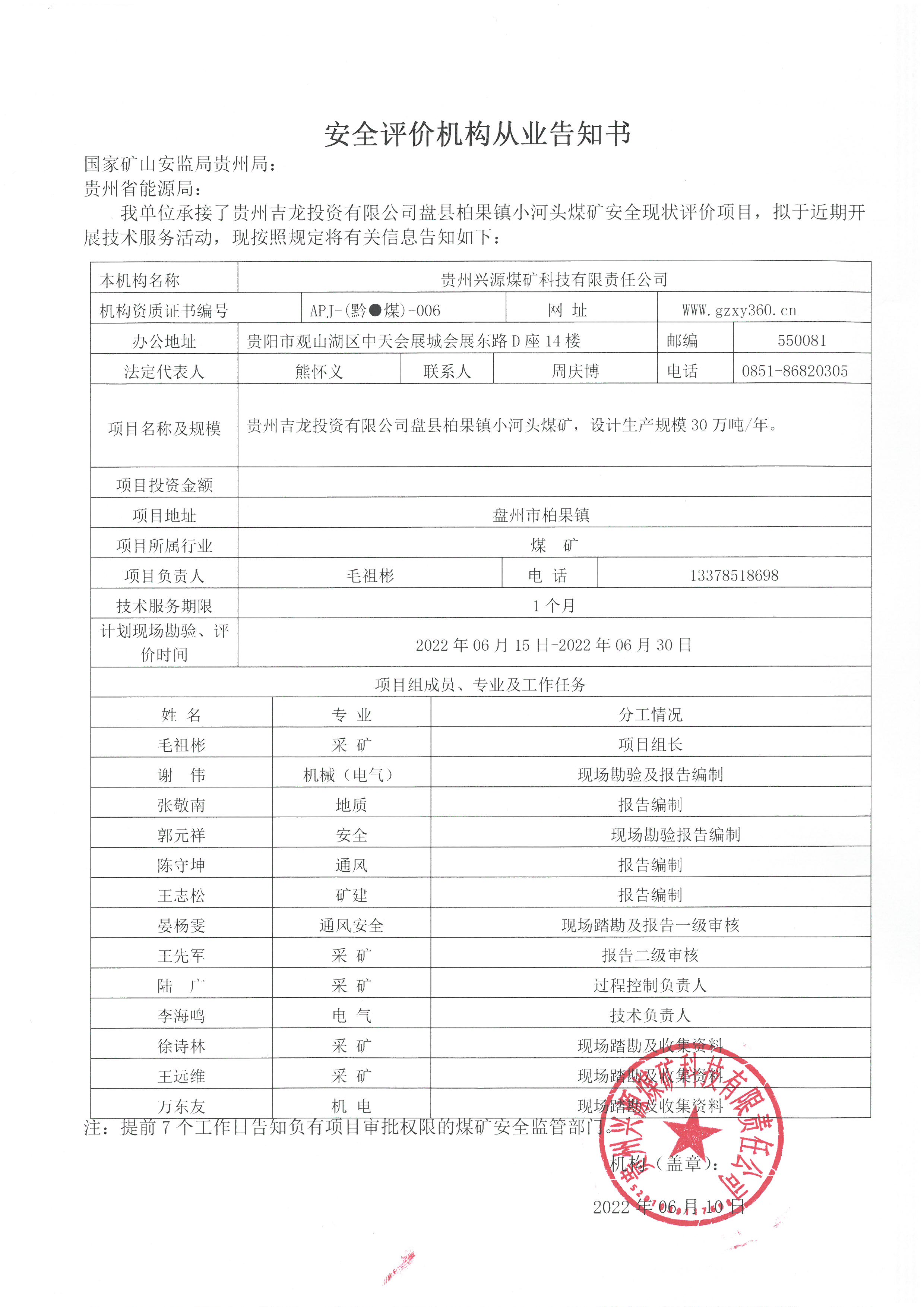 安全評價機構從業(yè)告知書(貴州吉龍投資有限公司盤縣柏果鎮(zhèn)小河頭煤礦安全現(xiàn)狀評價)