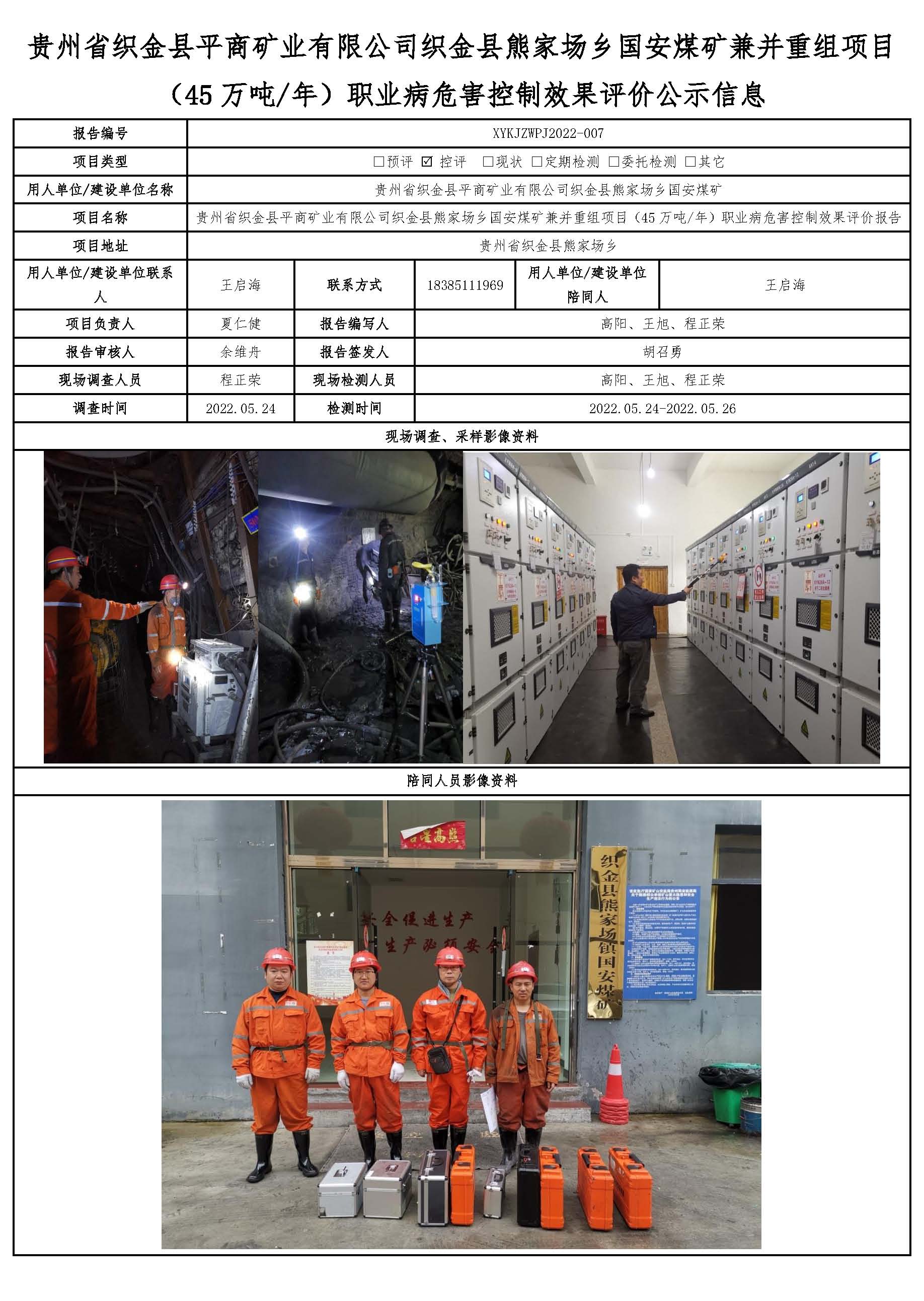 貴州省織金縣平商礦業(yè)有限公司織金縣熊家場鄉(xiāng)國安煤礦兼并重組項目職業(yè)病危害控制效果評價公示信息
