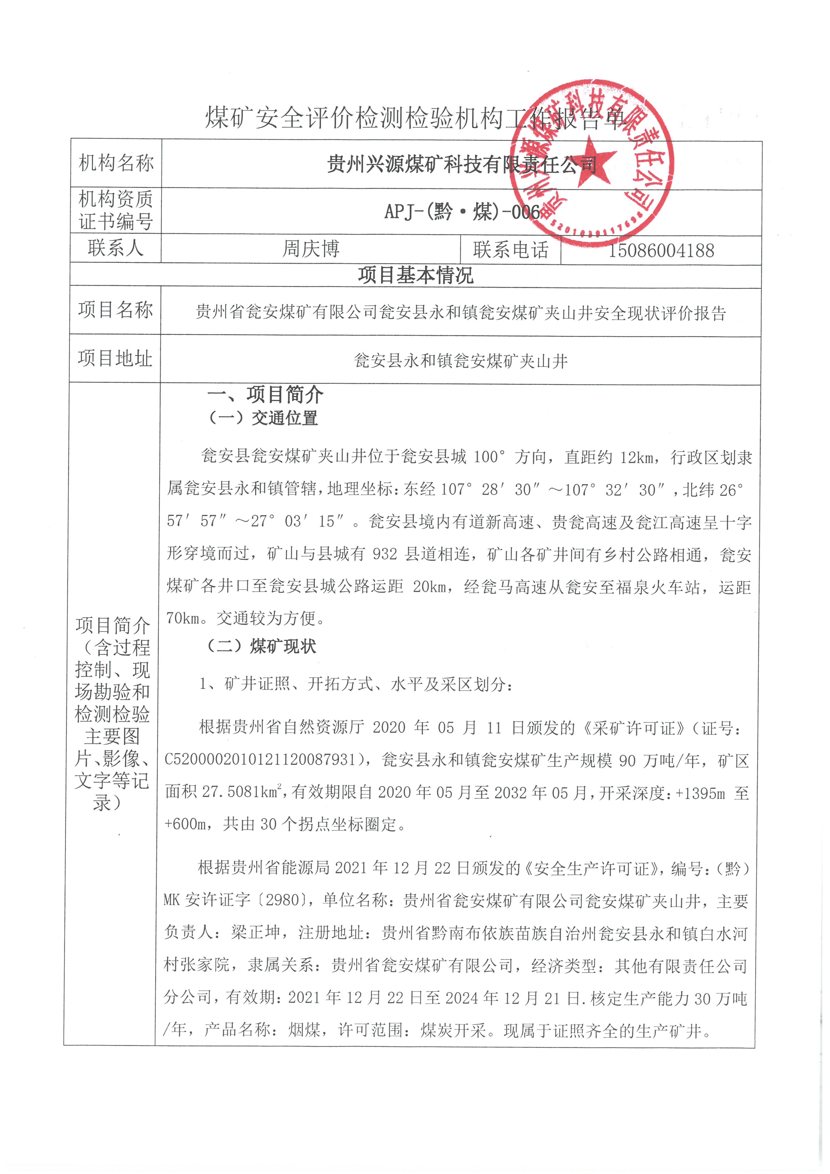煤礦安全評價檢測檢驗機構工作報告單[貴州省甕安煤礦有限公司甕安縣永和鎮(zhèn)甕安煤礦夾山井安全現(xiàn)狀評價報告]