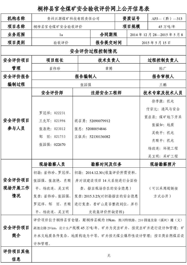 桐梓縣官倉煤礦安全評價業(yè)務(wù)網(wǎng)上公開信息表