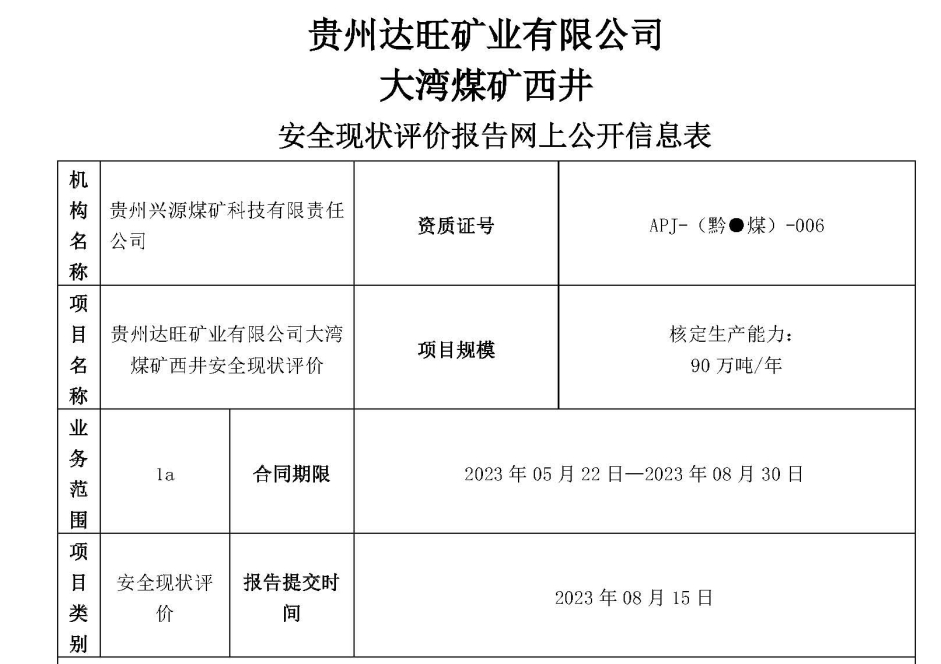 貴州達旺礦業(yè)有限公司大灣煤礦西井安全現(xiàn)狀評價報告網(wǎng)上公開信息表