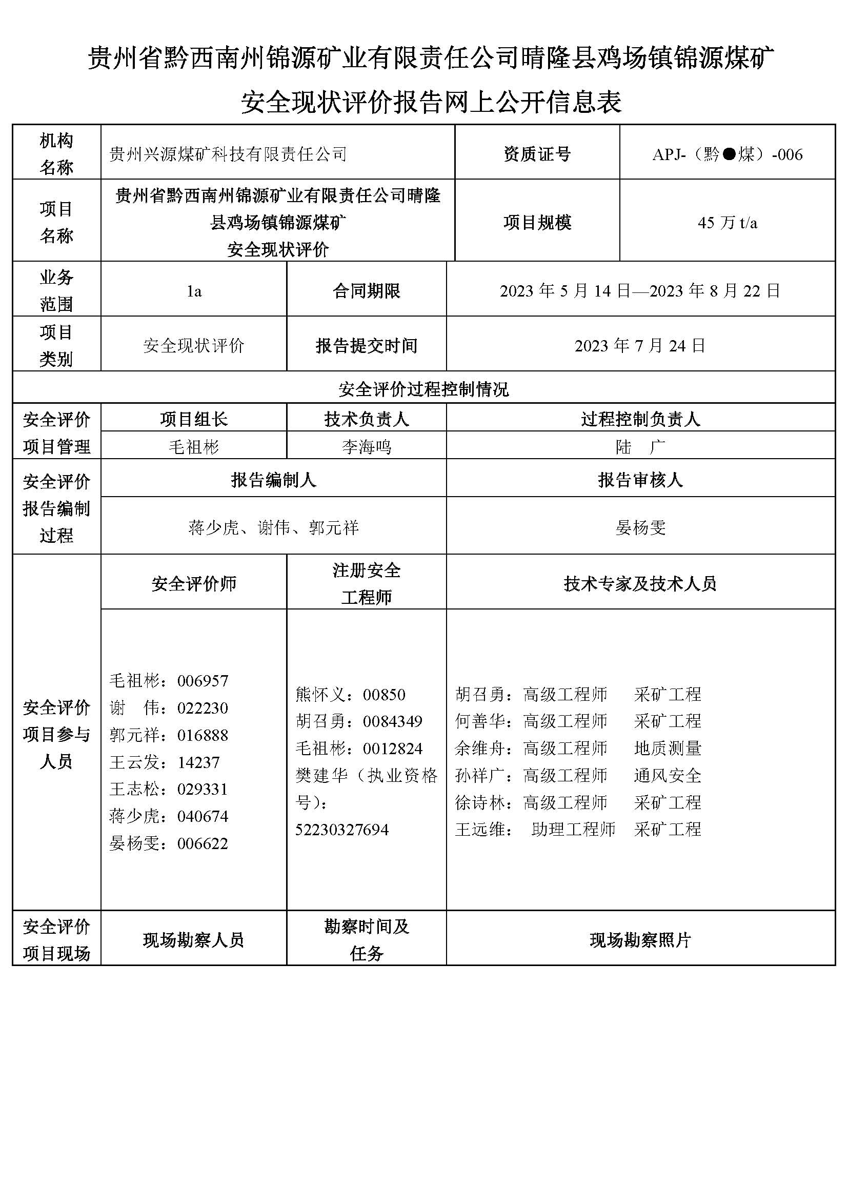 貴州省黔西南州錦源礦業(yè)有限責(zé)任公司晴隆縣雞場(chǎng)鎮(zhèn)錦源煤礦 安全現(xiàn)狀評(píng)價(jià)報(bào)告網(wǎng)上公開信息表