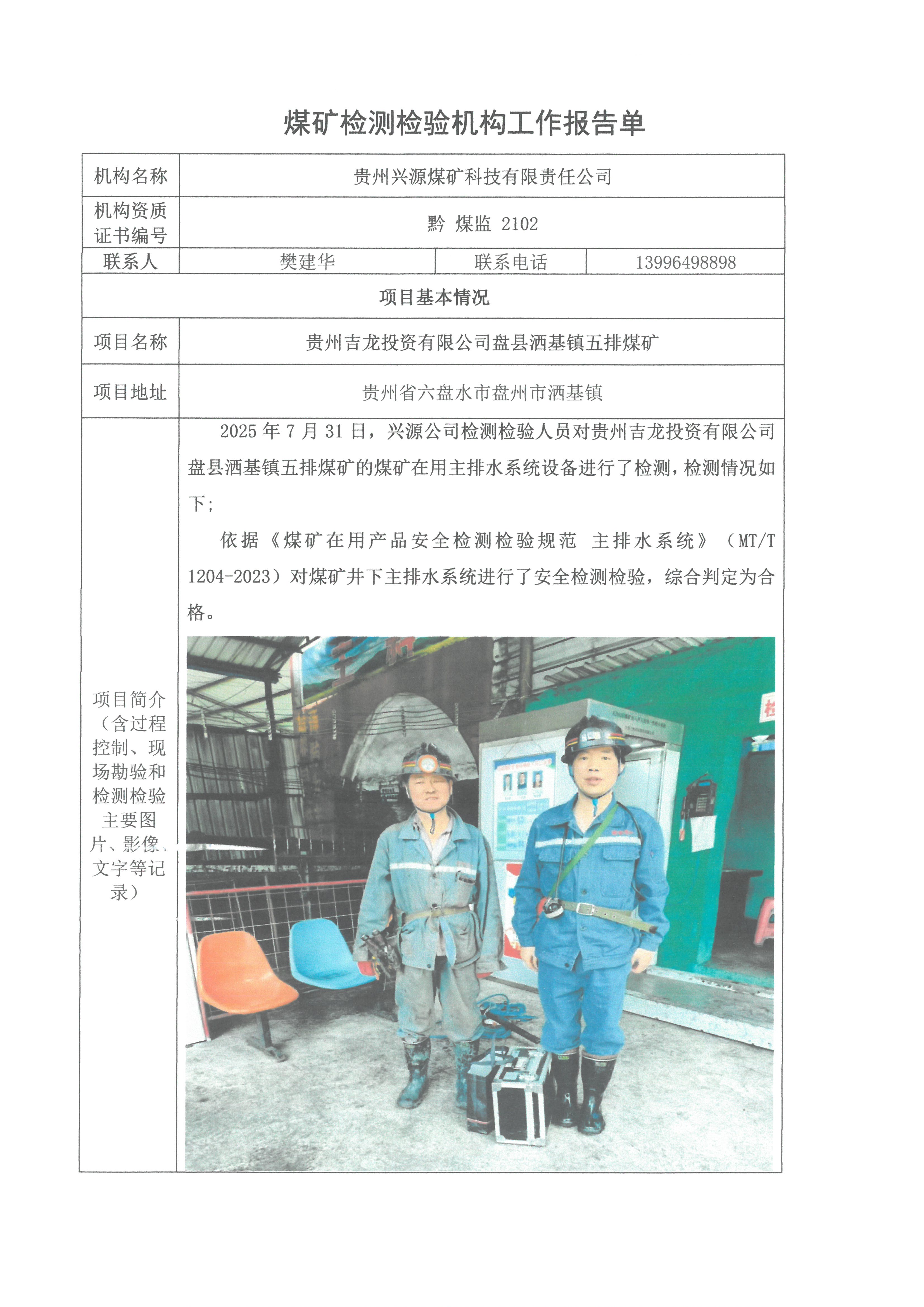 煤礦檢測(cè)檢驗(yàn)機(jī)構(gòu)工作報(bào)告單【貴州吉龍投資有限公司盤(pán)縣灑基鎮(zhèn)五排煤礦】